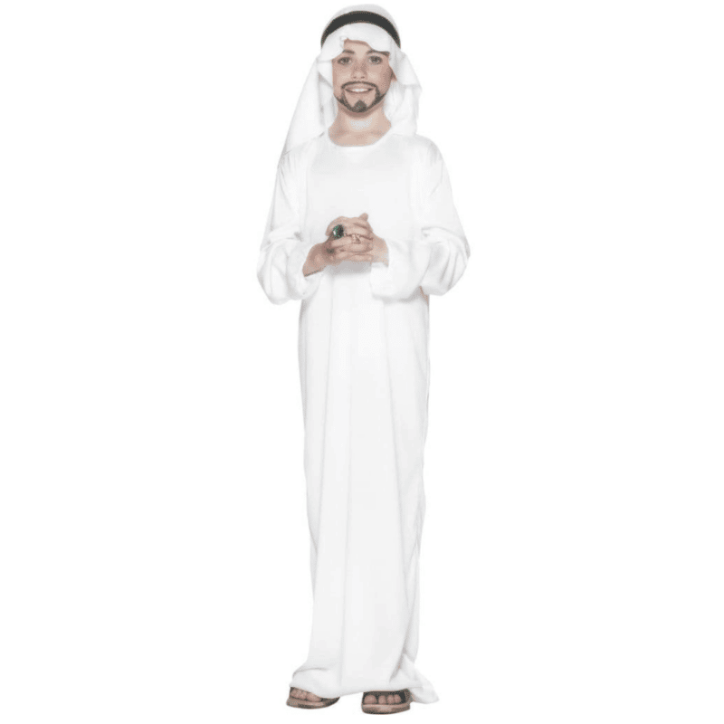 Valkoinen, perinteinen arabi-asu naamiaisiin. Sisältää valkoisen kaavun ja erillisen päähineen.