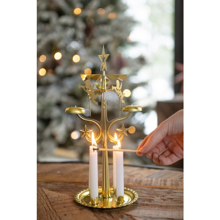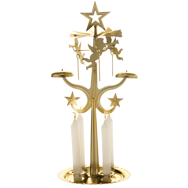 Pyörivä mekanismi: kynttilän lämpö pyörittää koristeita ja kelloja, jotka helisevät lempeästi ja rauhoittavasti