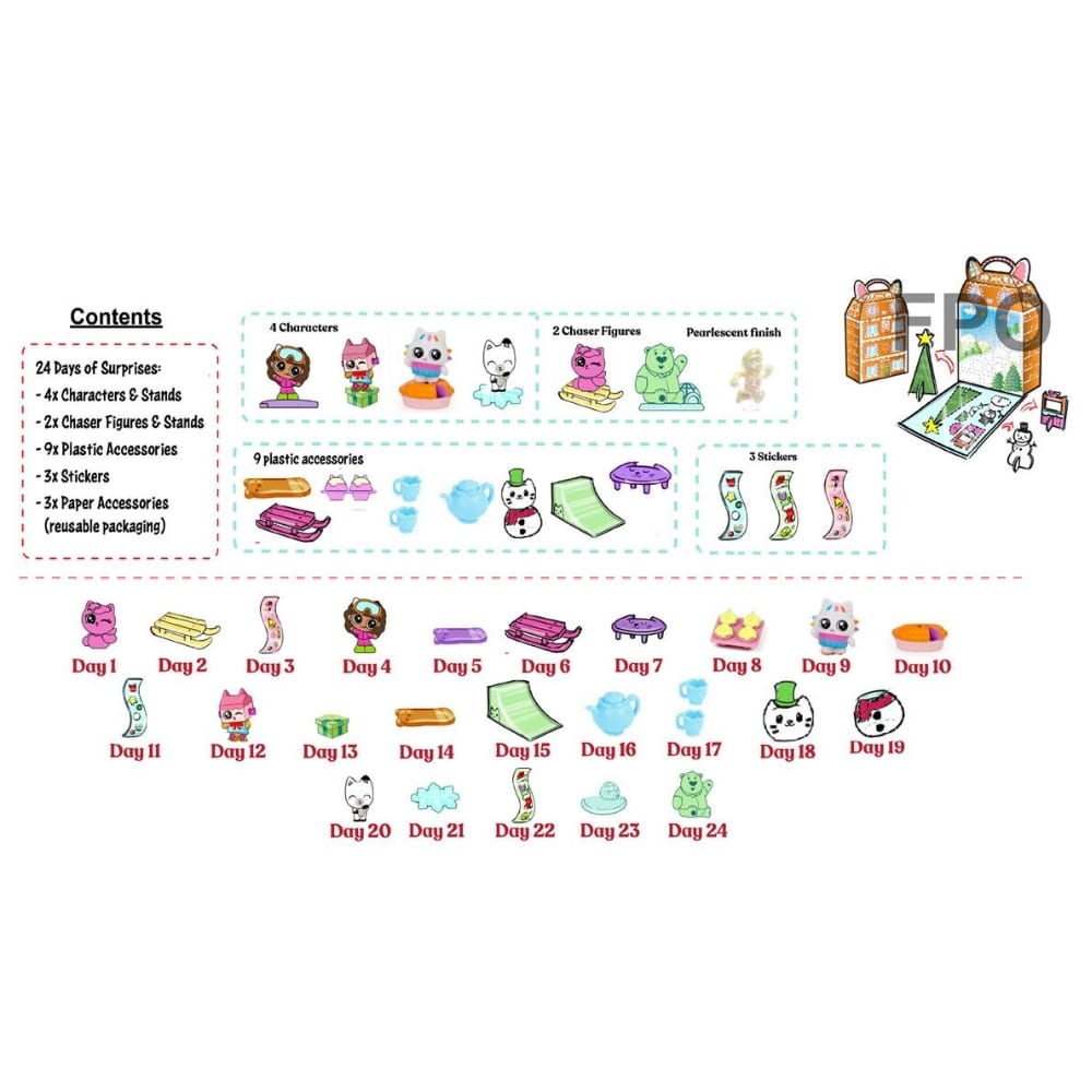 Laske päiviä jouluun Gabbyn Nukketalo -adventtikalenterin kanssa. Adventtikalenterista lapset löytävät joka päivä erilaisen juhlallisen Gabbyn Nukketalo -lahjan.