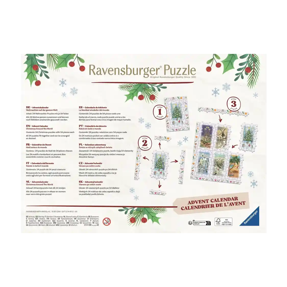 Joulukalenteri sisältää 24 minipalapeliä, joissa kussakin on 54 palaa. Palapelit esittelevät jouluisin koristeltuja kaupunkeja, maita ja nähtävyyksiä eri puolilta maailmaa. Voit liittää palapelit toisiinsa tai koota ne itsenäisinä – sinä päätät!