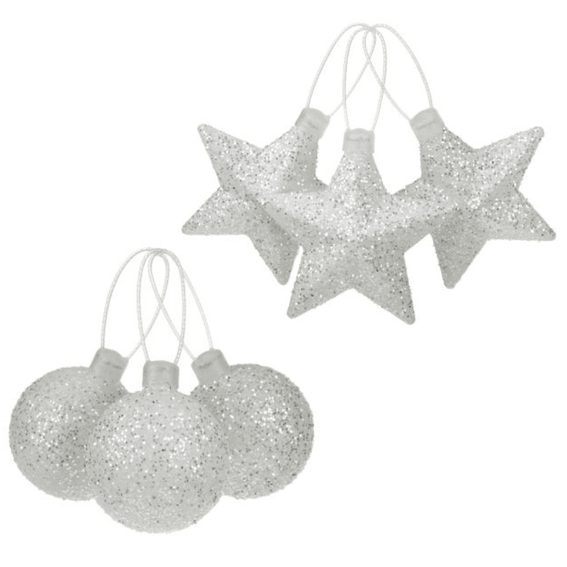 3 kpl valkoisia kuusenpalloja tai 3 kpl valkoisia tähtiä.