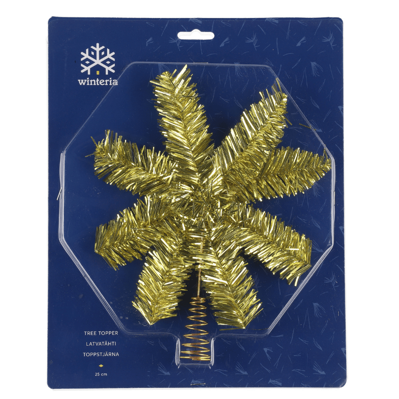 Perinteinen kullanvärinen latvatähti kiinnitetään kuusen latvaan metallisella pidikkeellä. Latvatähden halkaisija on noin 25 cm.