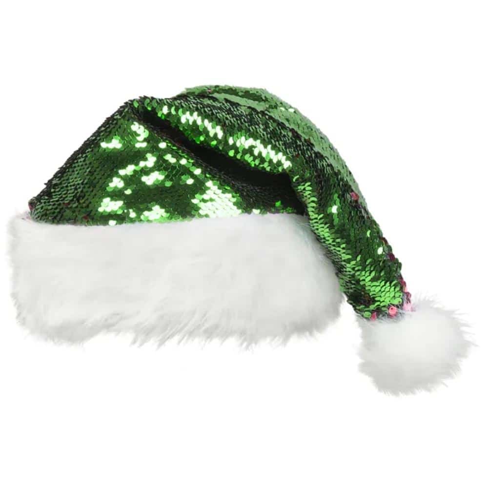 Tonttulakki glitteri punainen/vihreä – Tonttulakki kimaltevilla paljeteilla. Paljettien toinen puoli on punainen ja toinen vihreä. Niitä kääntämällä voit vaihtaa lakin väriä tai jopa tehdä siihen kuvioita.