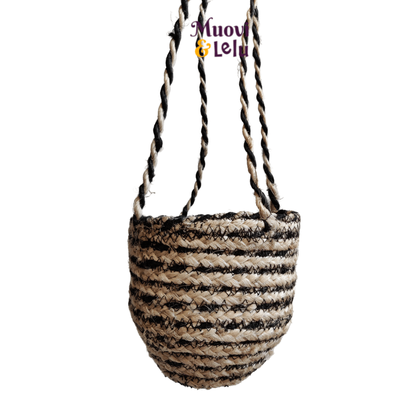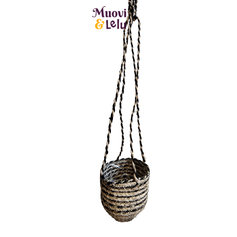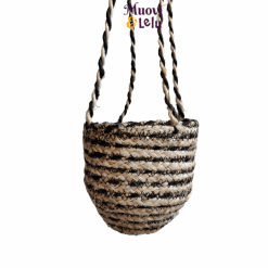 Tyylikäs musta-beessiraidallinen juuttiamppeli, joka on valmistettu meriheinäpunoksesta ja juutista.