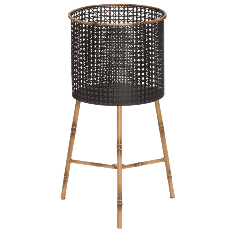 - Musta metallinen kori ja rottinkinen jalusta ovat elegantti yhdistelmä.