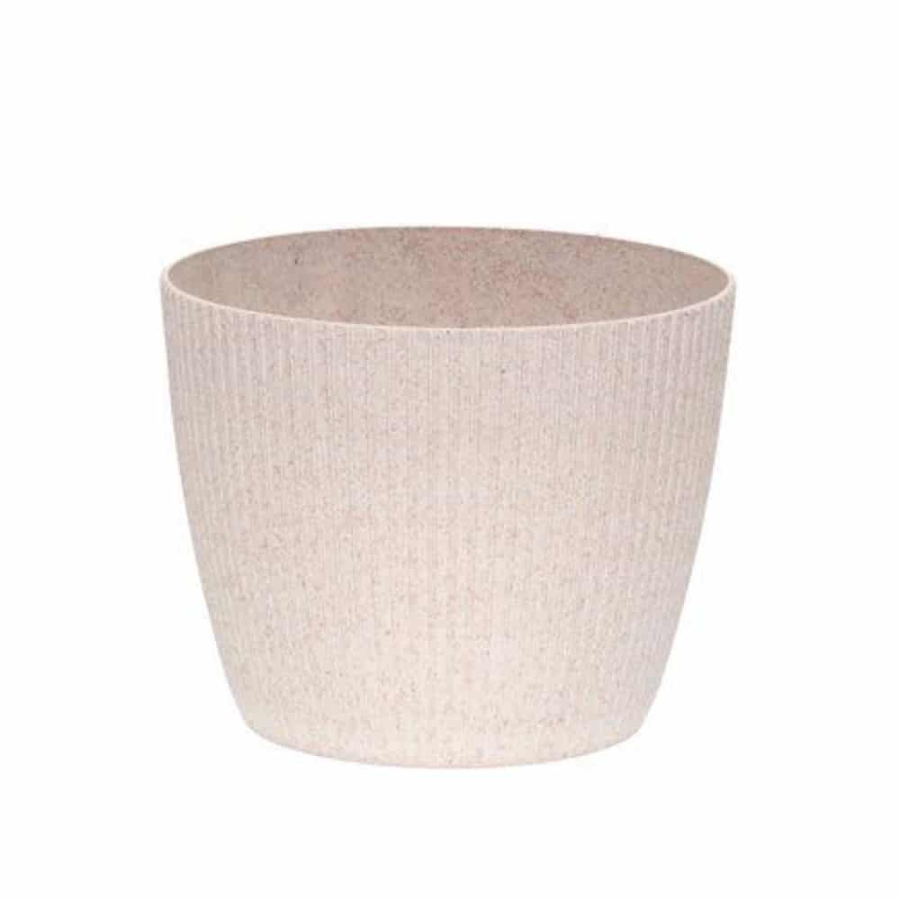 Tyylikäs ja kevyt suojaruukku sisä- ja ulkokäyttöön. Ruukun pinnassa hillitty pystyraidoitus. Tuote sisältää jopa 40% vähemmän muovia. Valmistuksessa muovimassaan on sekoitettu kierrätyspuuta, jolloin muovin määrä tuotteessa on pienempi.