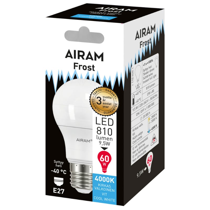 Sarjan lamput on suunniteltu erityisesti kylmiin olosuhteisiin. Pakkaslamppu ei päästä tarpeetonta hukkatehoa ulkoilmaan ja säilyttää toimintavarmuutensa ympäri vuoden. Käyttölämpötila-alue on erityisen laaja, 40 astetta sekä pakkasta että lämmintä. Ympäristöystävällisiin pahvipakkauksiin on merkitty hehkulamppuvastaavuus, joka helpottaa kuluttajan valintaa. Tekniset tiedot on esitetty selkeästi.