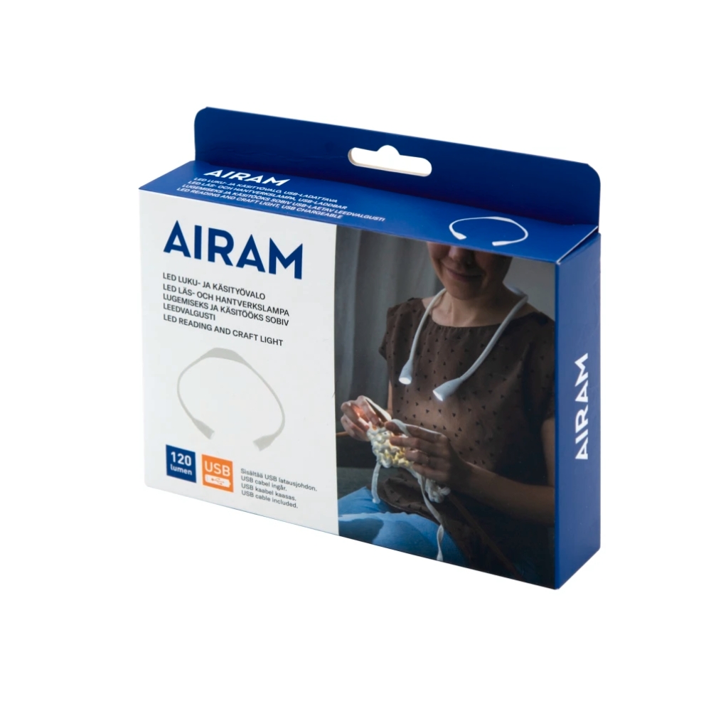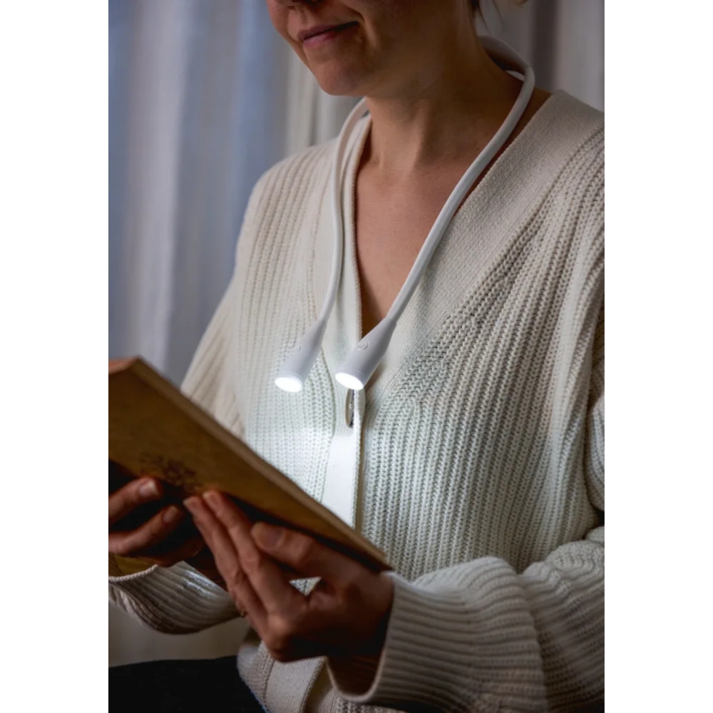 Kevytrakenteinen luku- ja käsityövalo on lukutoukan tai käsitöiden ystävän toivetuote! Kiepauta valo roikkumaan niskasi kautta ympäri ja anna valon langeta syliisi. Tuote vapauttaa kädet ja antaa sinun keskittyä tekemiseen. Lukuvalo antaa tehokasta valoa molemmista päistä. Valotehoa voi säätää kolmiportaisesti. Tuote on USB-ladattava, latausjohto mukana.
