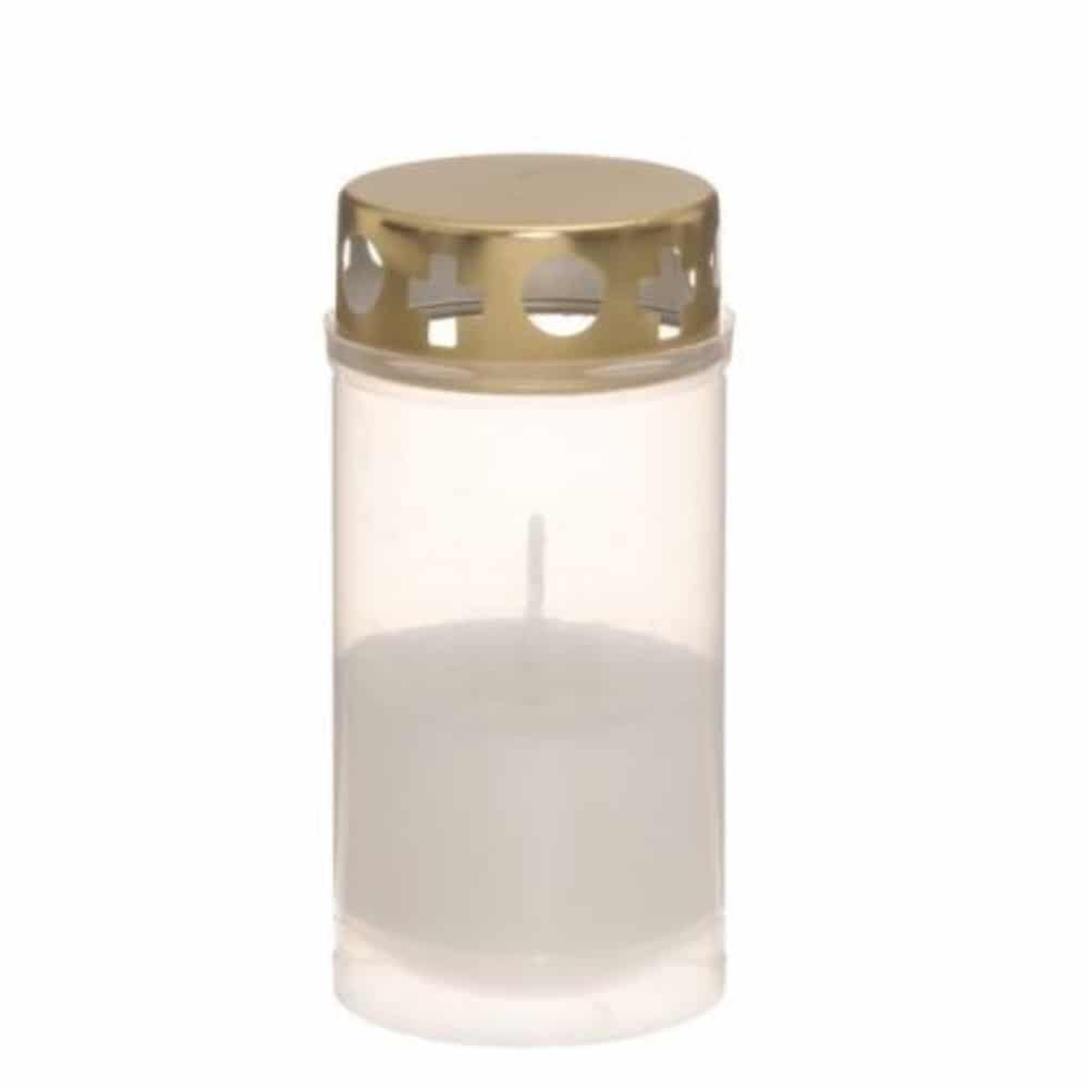 Hautakynttilä kullanvärisellä tuulisuojalla. Pohjan muotoilun ansiosta kynttilä polttaa kynttilämassan tasaisesti. Paloaika on noin 25 tuntia.