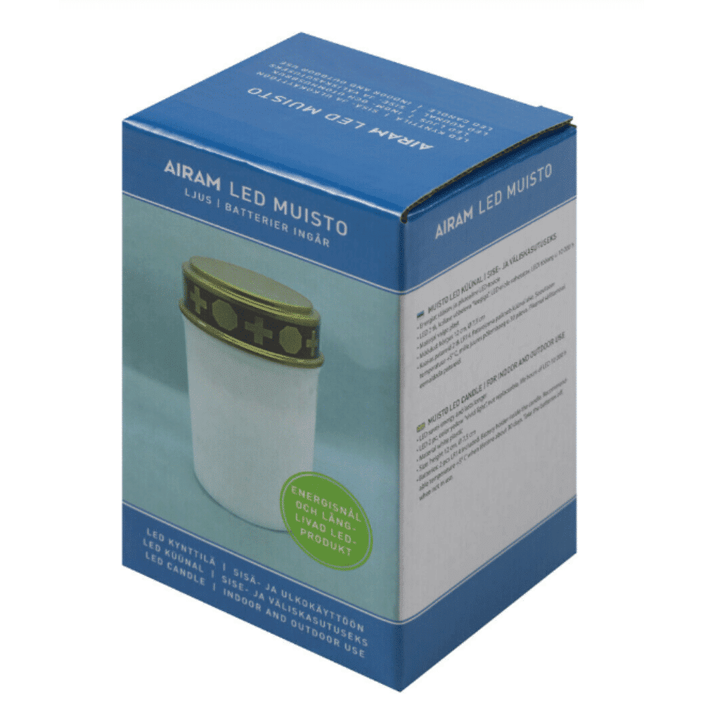 LED-hautakynttilä muisto Airam on ristikuvioin koristeltu ja soveltuu sekä sisä- että ulkokäyttöön. Led-tuote säästää sähköä ja luontoa. Led keltainen, eläväliekkinen, ei vaihdettava. Sisältää paristot. Materiaali muovi. On/off-kytkin.