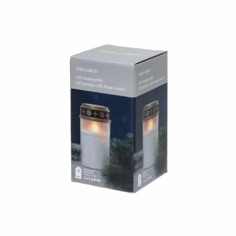 LED-hautakynttilä palaa läheisten muistoksi tuulisellakin säällä. Paloaika noin 40 vuorokautta paristoista ja olosuhteista riippuen. Kynttilä toimii 2 x C (LR14)-paristolla, jotka sisältyvät pakkaukseen.