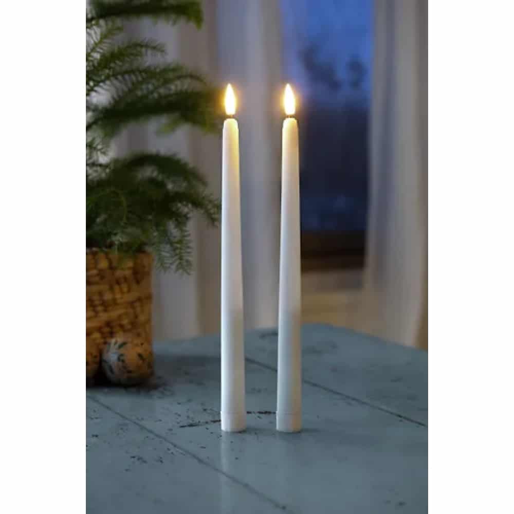 Luonnollisen näköiset koko valkoiset led-kruunukynttilät. Kynttilän korkeus 27,5 cm. Sisusta tai luo tunnelmallisia kattauksia. Lämpimän valkoinen led lepattaa aidon liekin tavoin. Pakkauksessa kaksi kruunukynttilää. Toimii 2 x AAA paristolla / kynttilä. Paristot eivät mukana pakkauksessa. Kynttilässä on on/off ja ajastintoiminto. Kruunukynttilän korkeus on noin 28 cm.