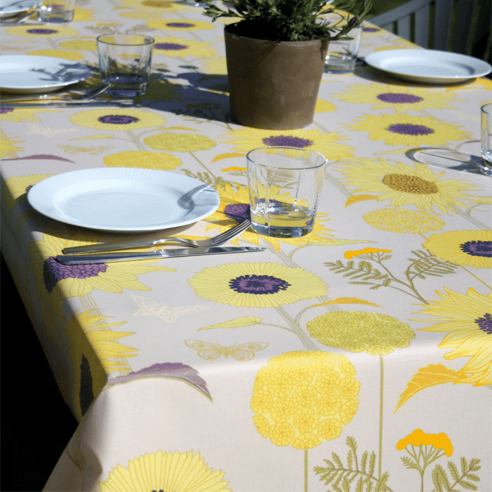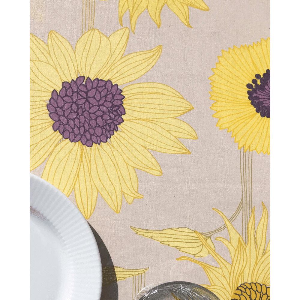 Kangasmainen kerniliina on laadukas ja juhlava vaihtoehto ja sopii myös mainiosti arkeen. Kerni 140 cm auringonkukka keltainen on aivan kangaspöytäliinan näköinen ja oloinen, mutta sitä on helpompi pitää puhtaana kuin kangasliinaa likaa hylkivän akryyli pinnan vuoksi. Kauniisti laskeutuva puuvillaliina kestää pieniä vahinkoja. Puhdista liinaa rätillä ja astianpesuaineella päivittäin. Kerniliinan voi myös pestä pesukoneessa 40 C kevyesti ja silittää miedolla lämmöllä nurjalta puolelta, jotta se ei näytä ryppyiseltä.