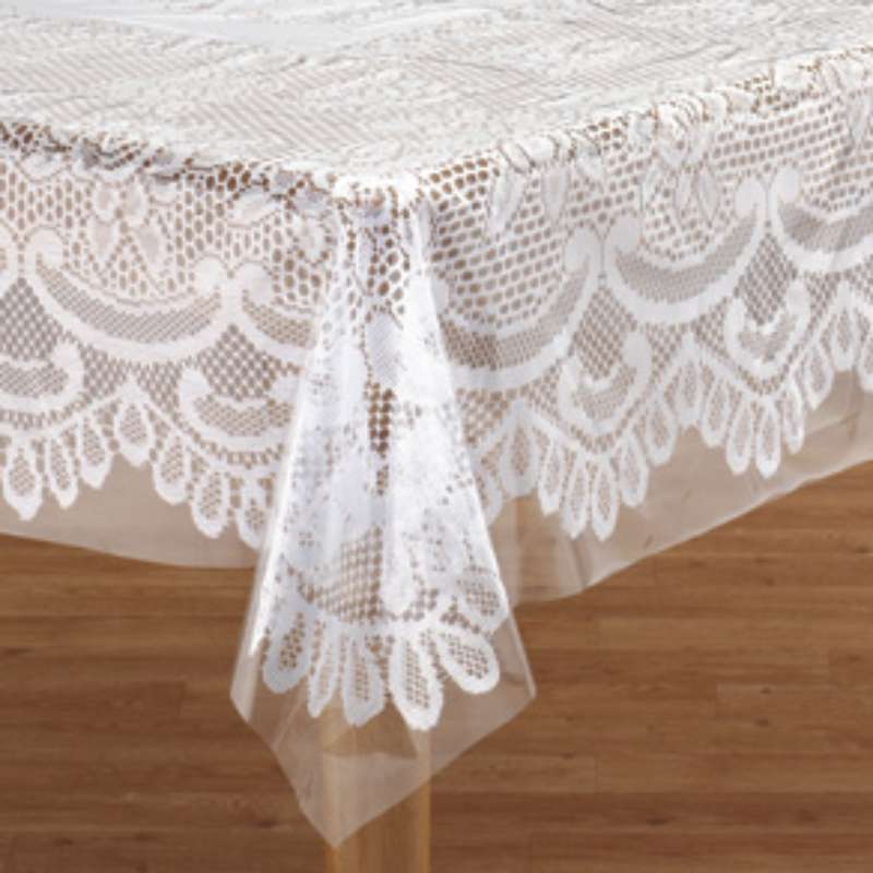 Kuvassa muovi suojaa pitsipöytäliinaa. Suojamuovissa ei ole mitään kuviota!