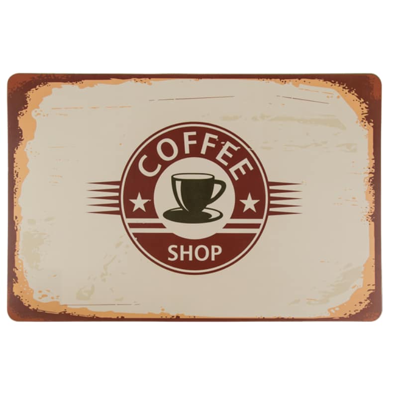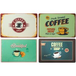 Käytännöllinen ja hieno kahvi kuvioinen pöytätabletti pitää pöytäsi siistinä ja suojaa sitä kolhuilta. Pöytätabletti on helppo pyyhkiä puhtaaksi kostealla liinalla. Lajitelmassa on neljä eri kahvi aiheista kuvaa.