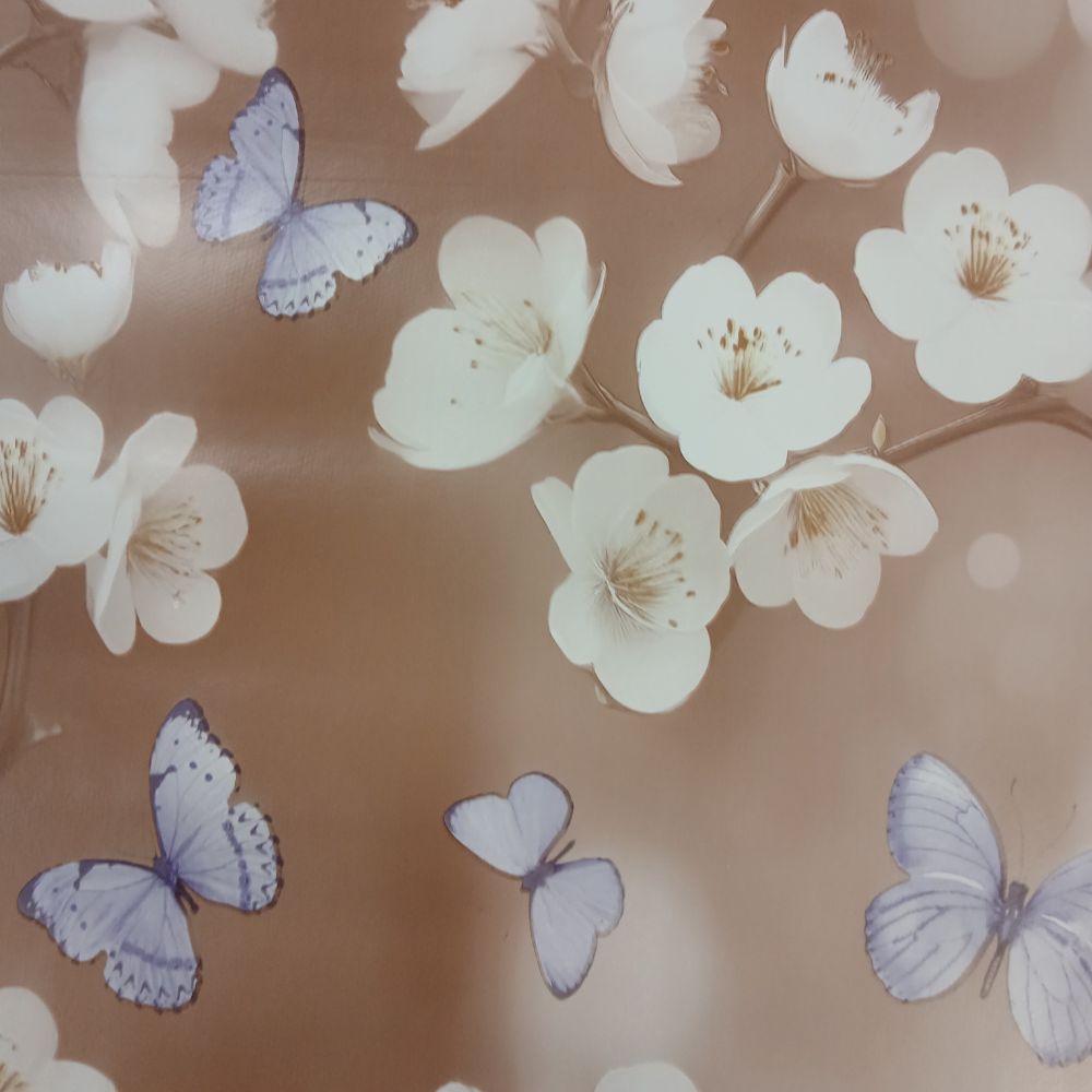 Kuosissa on lempeitä valkoisen ja violetin sävyjä.