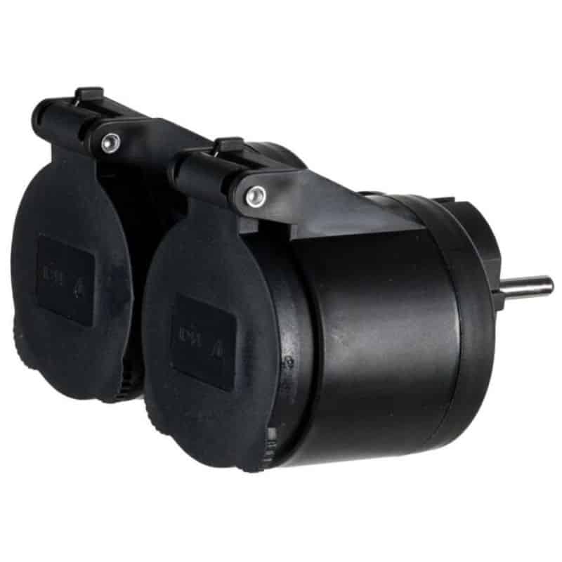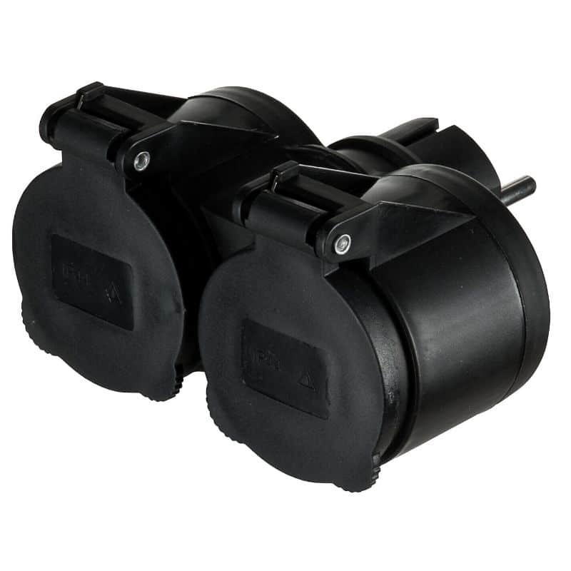 2-Osainen ulkohaaroitin 16A ip44 musta. Lapsiturvallinen. Ulkokäyttöön tarkoitettu haaroitin, varustettu läppäkansilla, roiskevesitiivis.