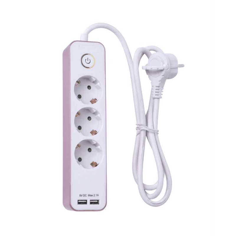 3-osainen jatkojohto, jossa vaaleanpunainen kuori ja on/off-kytkin, tupla USB 2,1A. Litteä pistotulppa, jonka ansiosta jatkojohdon voi helposti sijoittaa ahtaassa paikassa olevaan pistorasiaan, kuten huonekalun taakse.