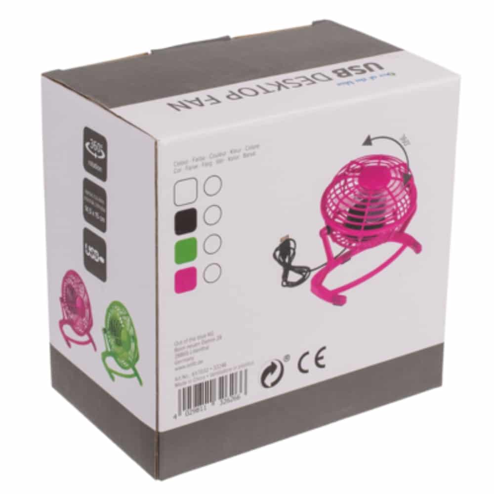 Soveltuu tuulettamaan kuumia tiloja, joissa ei ilma virtaa. Värivalikoimassa on neljä väriä: musta, vihreä, valkoinen ja pinkki. Mukana tulee USB-johto.