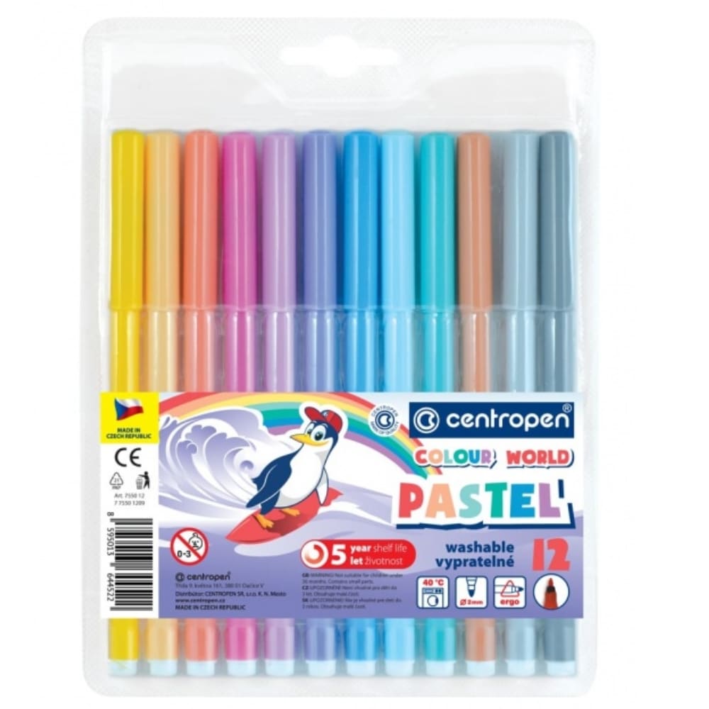 Huopakynä Colour World Pastel – Pastellisävyisiä tusseja on pakkauksessa 12 erilaista. Kynissä on painamista kestävä pyöreä kärki ja viivan paksuus on 1 mm. Rungossa on ergonomiseksi muotoiltu ote. Muste on myrkytön. Turvallisuutta lisää ilmastoitu korkki. Muste lähtee pois pesussa. Kestää hyvin kuivumatta.