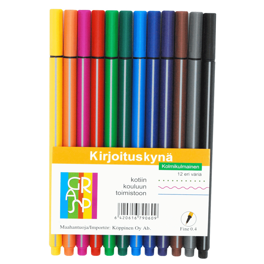 Huopakynä (kuitukärki) GRASP on ergonominen 3-kulmainen kirjoituskynä ja se pysyy tukevasti kädessä. Hauskat värit edesauttavat luovaa kirjoittamista. Pakkauksessa on 12 väriä.
