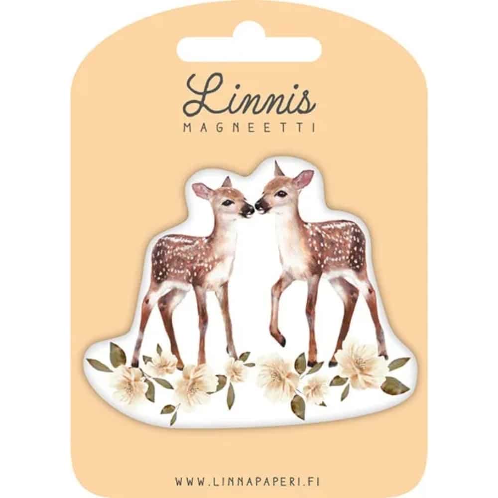 Magneetti bambit Linnis – Suloinen jääkaappimagneetti, jossa on kuva kahdesta peuranvasasta. Hartsipinnoite. Originaali: Hanna-Maria Mainelakeus.