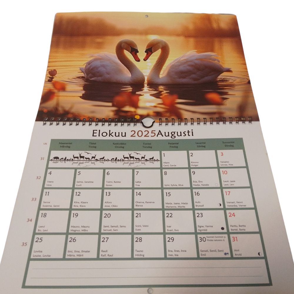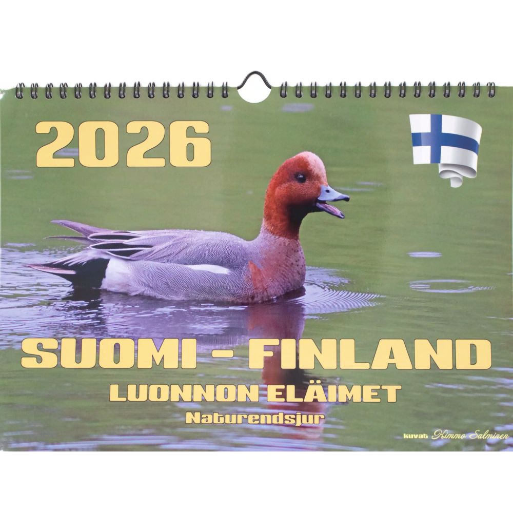 Seinäkalenteri Suomen luonnon eläimet 2026 Aika – Suomen luonto aiheinen suomen- ja ruotsinkielinen 2026 vuoden seinäkalenteri! Kalenterissa on kuvattu erilaisia Suomen luonnon eläimiä, kuten joutsen, kotka, orava ja karhu.
