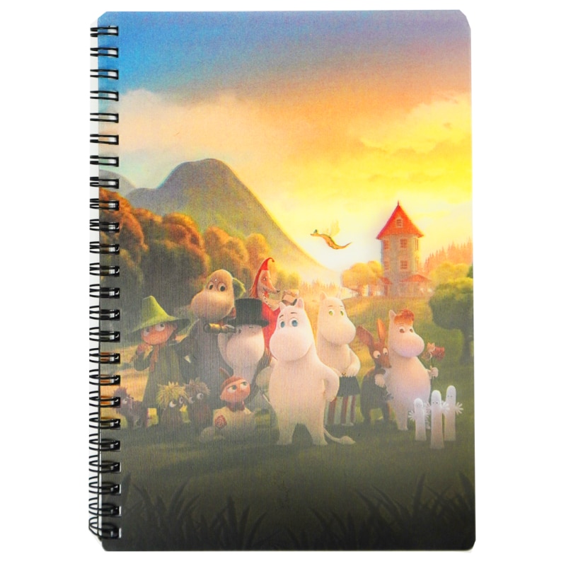 5A kokoinen kolmiulotteinen Muumivihko, jonka kannessa poseeraa Muumiperhe. Vihkon sivut ovat viivoitetut. Vihkoa voi käyttää esimerkiksi opiskeluvihkona tai päiväkirjana ja sen voi ottaa myös helposti mukaan.
