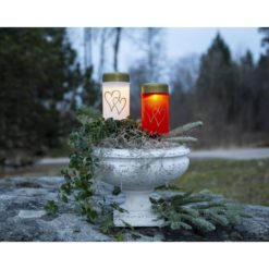 Tämä sopii esimerkiksi läheisen haudalle, pihalle tai parvekkeelle ilman maatikkua. Maapiikin avulla kynttilä on helppo asettaa maahan. Kynttilässä on lämpimän valkoinen valo, joka syttyy hämärän tullen.
