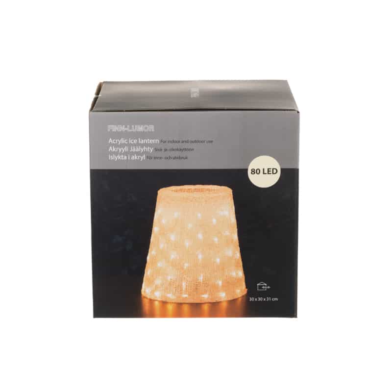 Kaunis jäälyhty koristaa talvipihaa, vaikka pakkasasteet eivät riittäisikään jäälyhtyjen valmistamiseen. Lyhdyn sisällä on 80 kpl LED-valoja. Pakkaus sisältää 10 m liitäntäjohdon ja muuntajan (IP44). Soveltuu sisä- ja ulkokäyttöön.