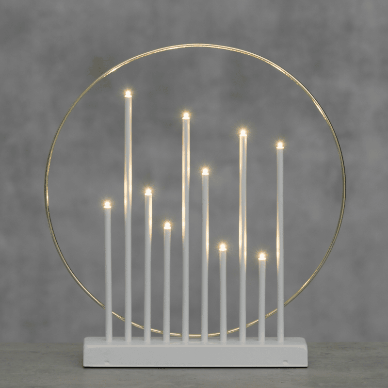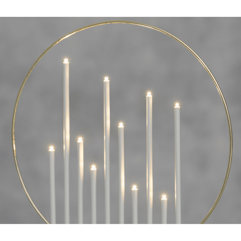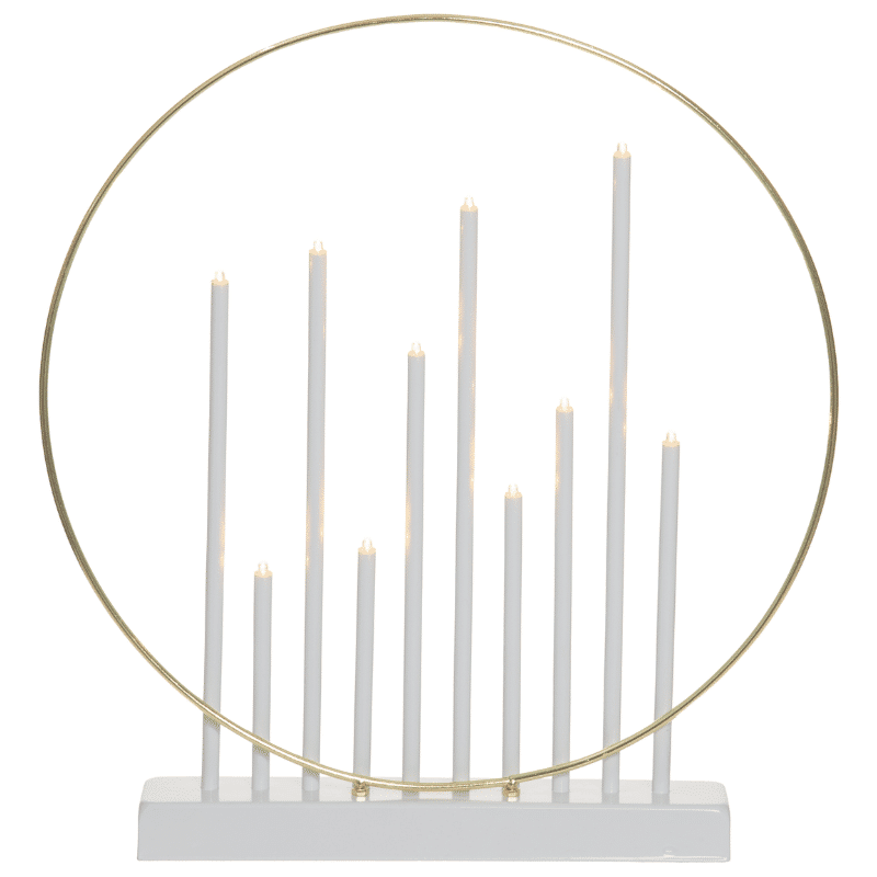 Kaunis ja moderni metallinen 10-haarainen kynttelikkö, jota koristaa kullanvärinen kehä. Kynttilässä on lämpimän valkoiset LED-lamput. 10 kpl 3V 0,06W (ei vaihdettavissa)