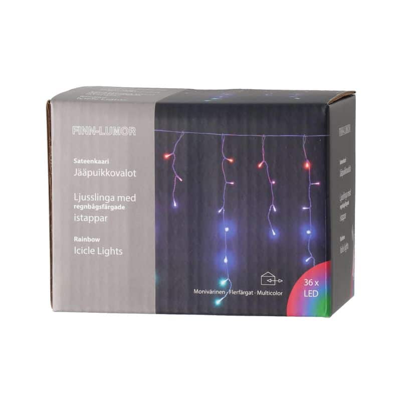 Led jääpuikko värikkäät sateenkaari valot sisä- ja ulkokäyttöön. Valoaiheen pituus on 90 cm. Tunnelmavalossa on 36 lediä 10 cm välein. Liitäntäjohto on 10 metriä pitkä. Muuntaja 3,2V 0,96W, IP44, 0,06W