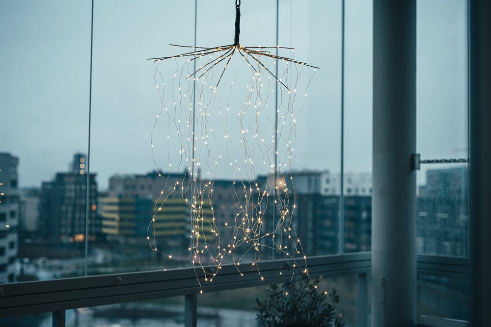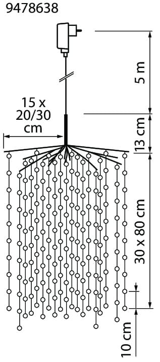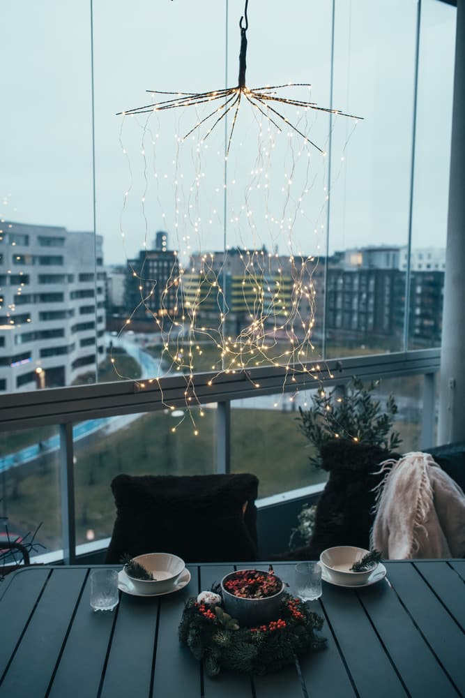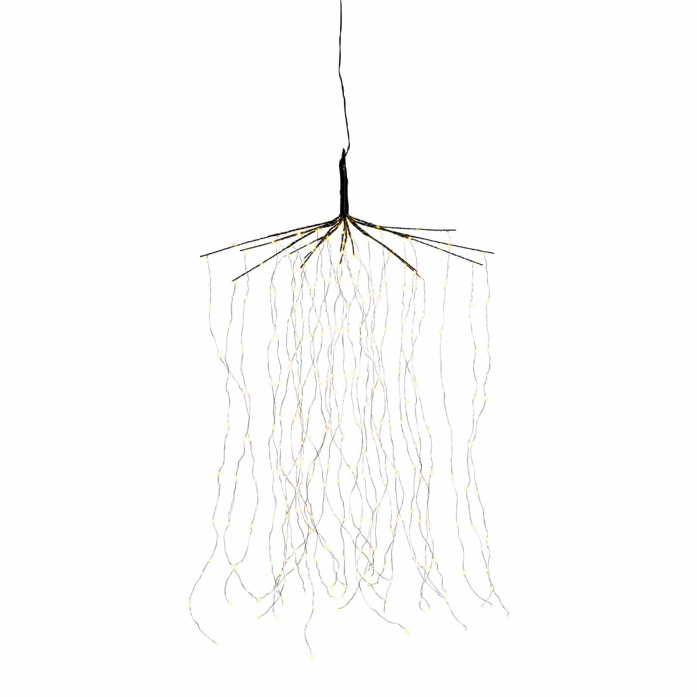 Näyttävä koriste, joka tuo upean valon esim. aseteltuna roikkumaan parvekepöydän ylle tai terassille. Taivuta oksat (15 kpl) auki ”sateenvarjomaisesti” ja sen jälkeen rullaa auki valolangat, joita on jokaisessa oksassa kaksi kpl. Valolangat voi jättää roikkumaan tai taivuttaa haluttuun muotoon. Led 300 kpl: 10 kpl/ valolanka, lämmin valkoinen, ei vaihdettava. Materiaali metalli ja muovi. Valolankojen johto hopea, liitosjohto musta.