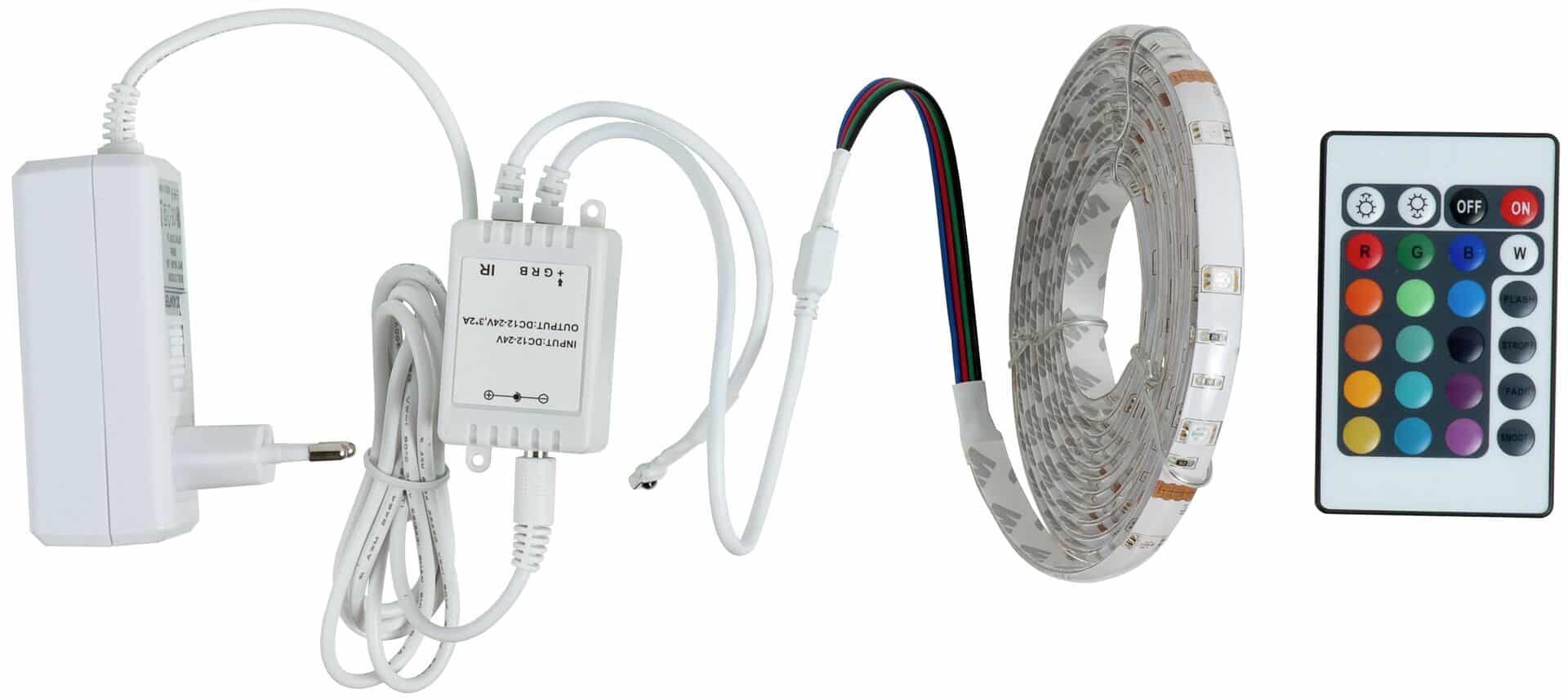 Hallinnoi RGB led-nauhan toimintoja helppokäyttöisellä kaukosäätimellä: valkoisen valon lisäksi 15 eri valon värivaihtoehtoa, himmennys ja neljä erilaista ohjelmaa. Korosta ja sisusta valolla. Ohuen nauhan asennustilan tarve on vähäinen. Taipuisaa nauhaa voi lyhentää erillisen ohjeen mukaan 100 mm välein. Pistokemuuntaja, johdossa on/off-kytkin. Kiinnitä suoraan puhtaalle pinnalle led-nauhan takana olevalla 3M-tarralla tai käytä alumiiniprofiilia. Tutustu myös Led Strip ja Power -led-nauhoihin.