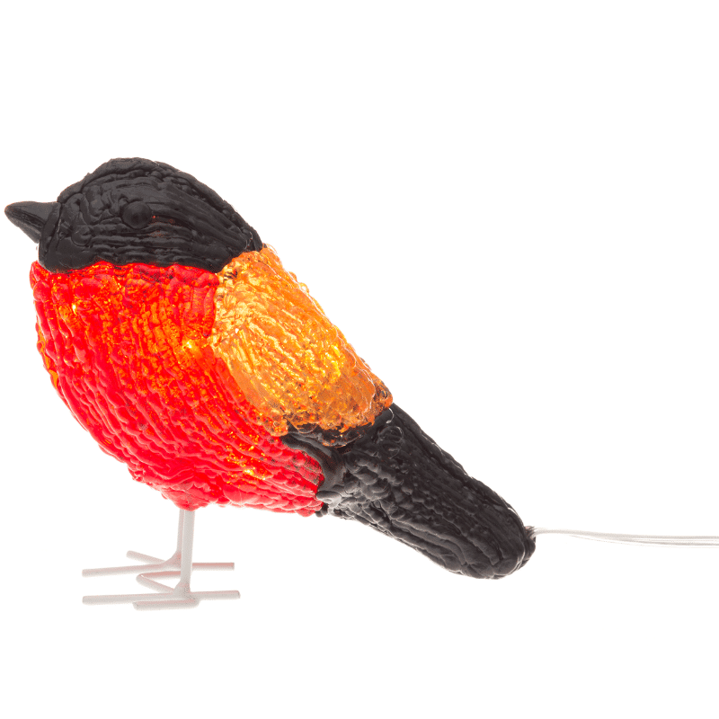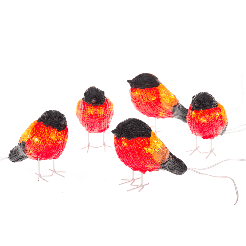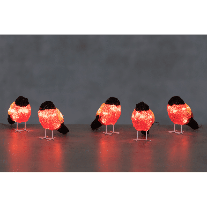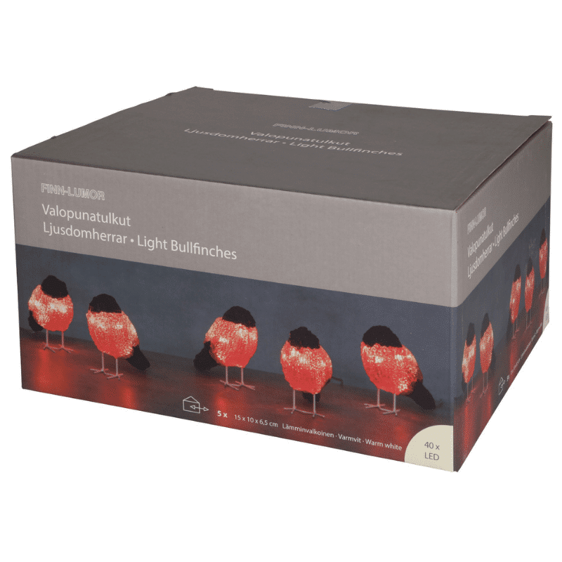 Valosarjassa 5 kpl pikkulintuja. Linnun koko 15 x 11 x 6,5 cm. Lämminvalkoinen LED valot. Liitosjohto 5 m. Muuntaja 24V, IP44. Sisä- ja ulkokäyttöön.