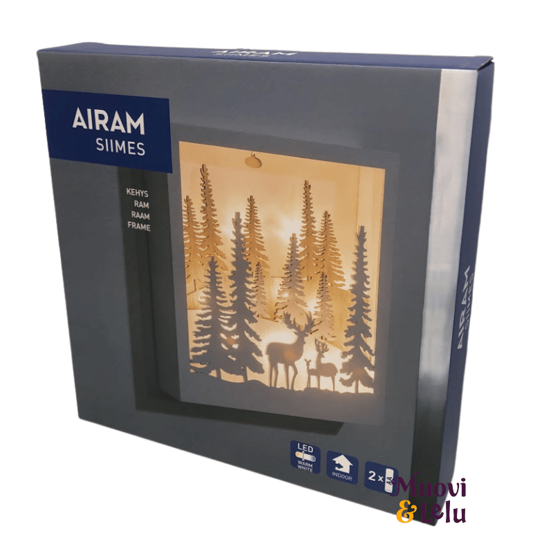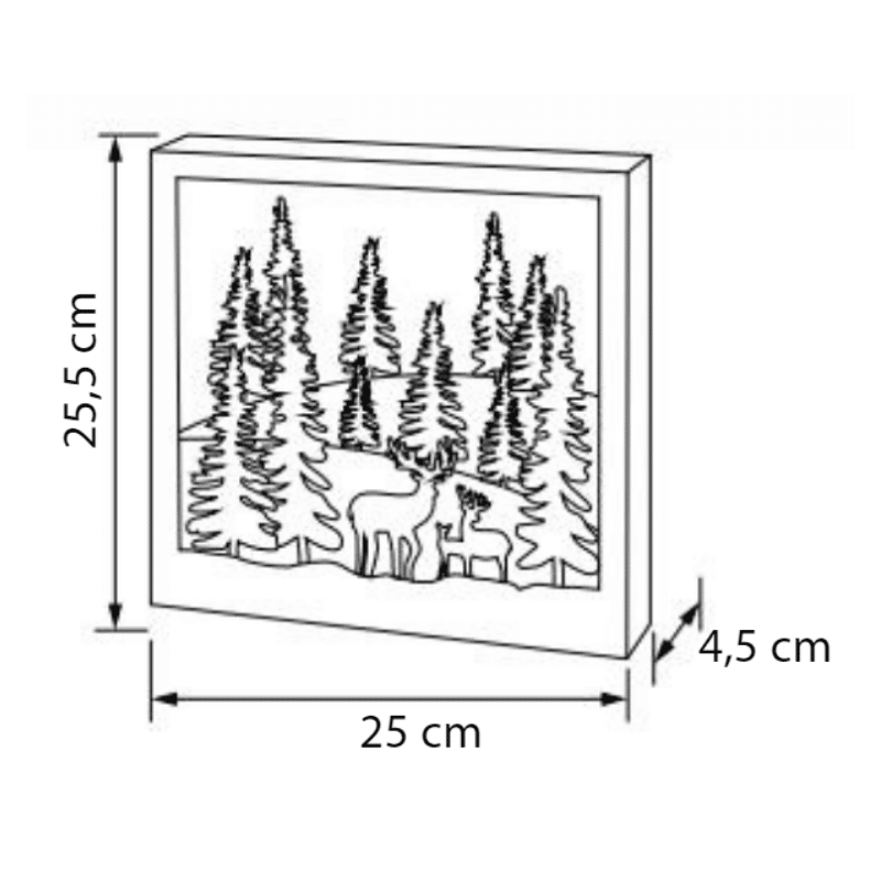 Kaunis pöytä-, seinä- tai ikkunakoriste. Luminen maisema, jossa kaurisperhe kokoontuu metsän siimeksessä. Valo kajastaa kukkulan takaa. Materiaali puu. On/off-kytkin. Vain sisäkäyttöön.