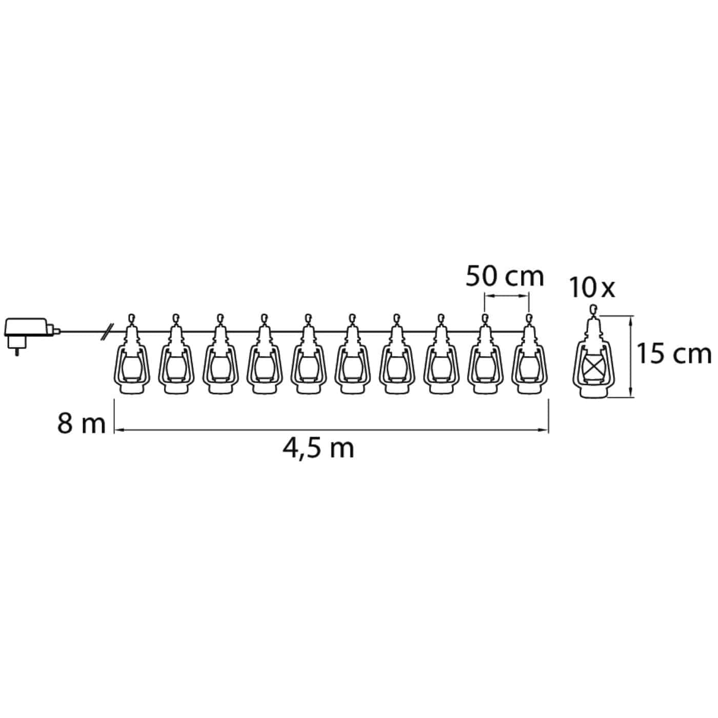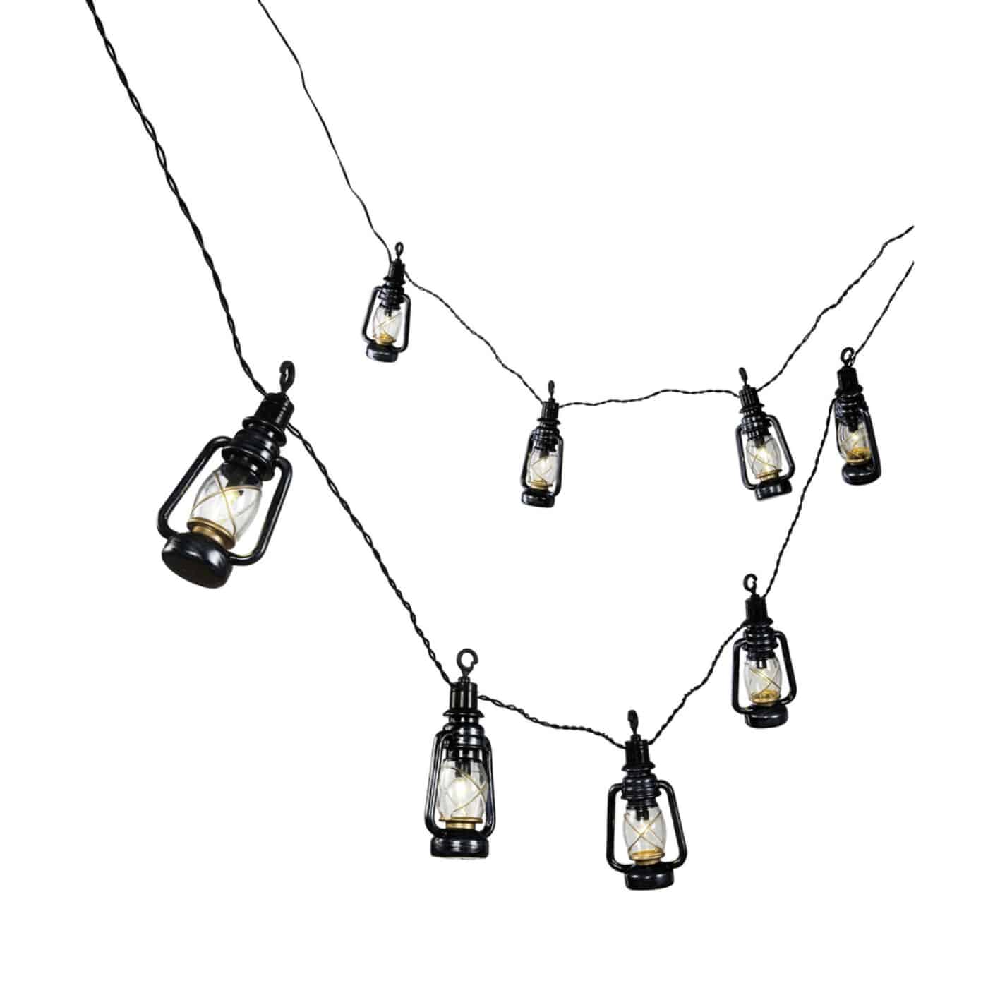 Klassinen antiikkimusta tallilyhty, jossa irroitettava lyhtysuojus. Pienet kiinnityskoukut. Led 10 kpl lämmin valkoinen, ei vaihdettava. Materiaali metalli ja muovi. Johto musta.