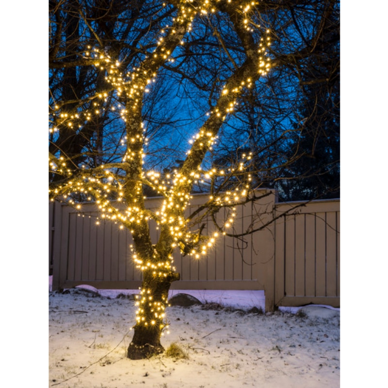 Valosarja 15 m, joilla luot näyttäviä pihakoristeluita. Teno-sarjoja voidaan myös ohjata netistä ladattavan applikaation kautta. QR-koodi applikaatioon löytyy muuntajasta. Led lämmin keltainen, ei vaihdettava, kytketty 100 ledin sarjaan. Johto musta.