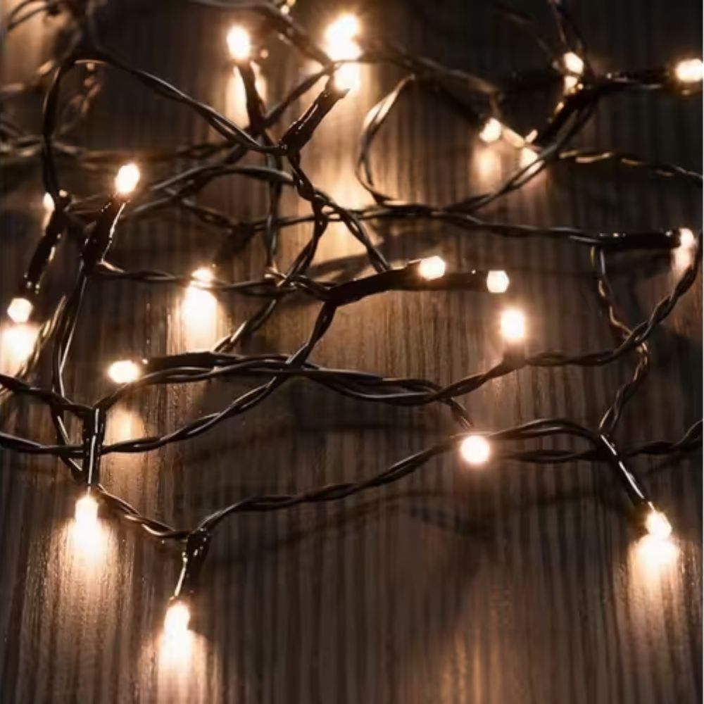 Led valoketju 80 led lämmin valkoinen 8 m Valosarja on säänkestävä (IP44) ja varustettu pitkällä 5 metrin liitäntäjohdolla, joten asennus onnistuu helposti. Mukana käytännöllinen säilytyslaatikko, joka suojaa valot kauden ulkopuolella.