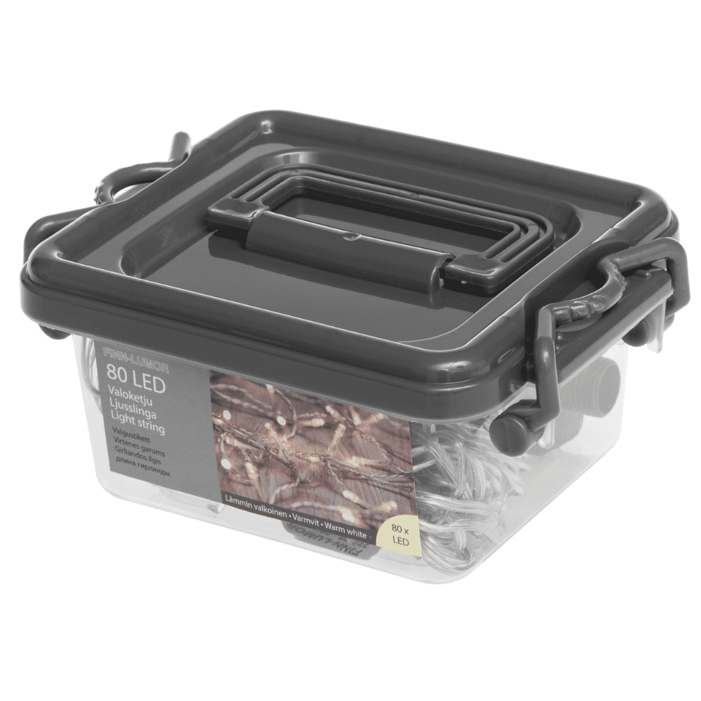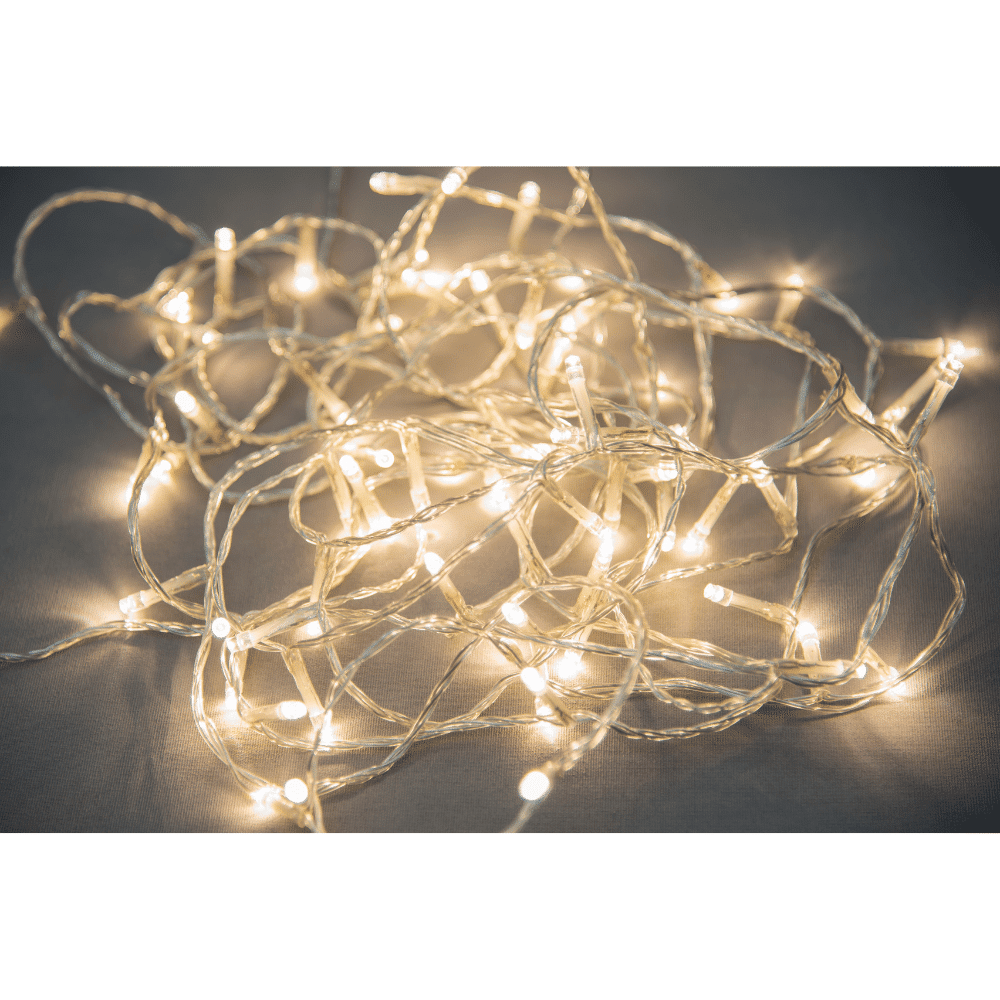 Valoketjuilla voit muuttaa minkä tahansa tilan kutsuvaksi keitaaksi. Ihanteellinen tunnelmavalaistus terasseille, parvekkeille ja puutarhaan, häihin ja muihin juhliin. Tekniset tiedot: 80 kpl lämmin valkoinen LED, 3V 0,06W. Valoaihe 7,9 m. Ledit 10 cm välein. Läpinäkyvän johdon pituus 5 m. Kokonaispituus 12,9 m. Muuntaja Muuntaja 3,6W. Sisä- ja ulkokäyttöön.