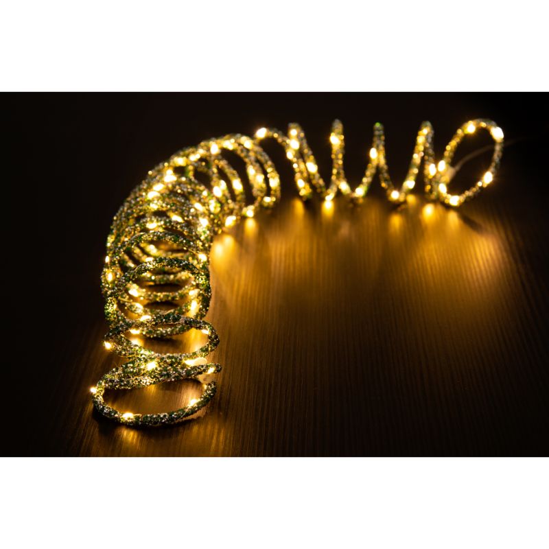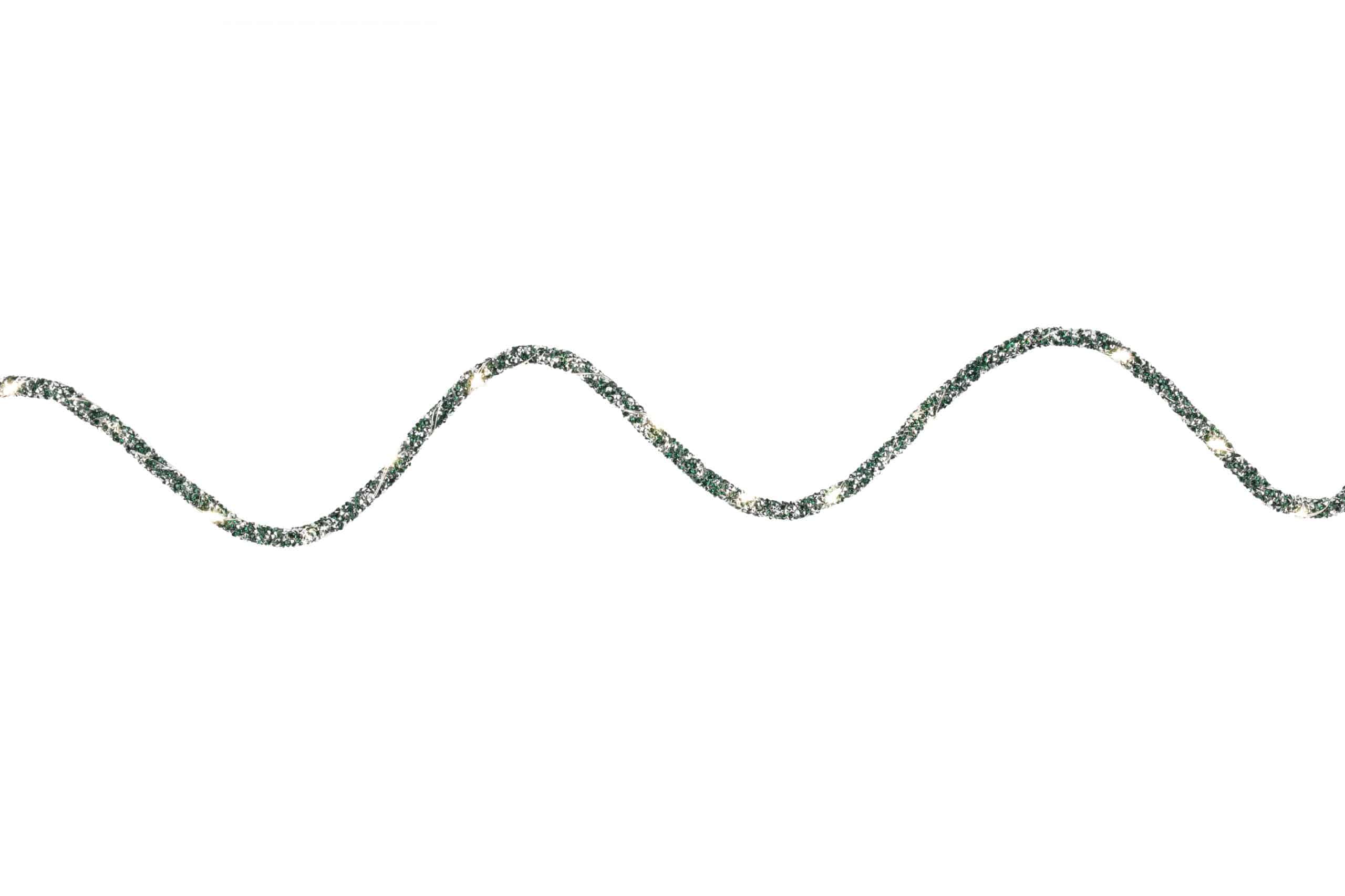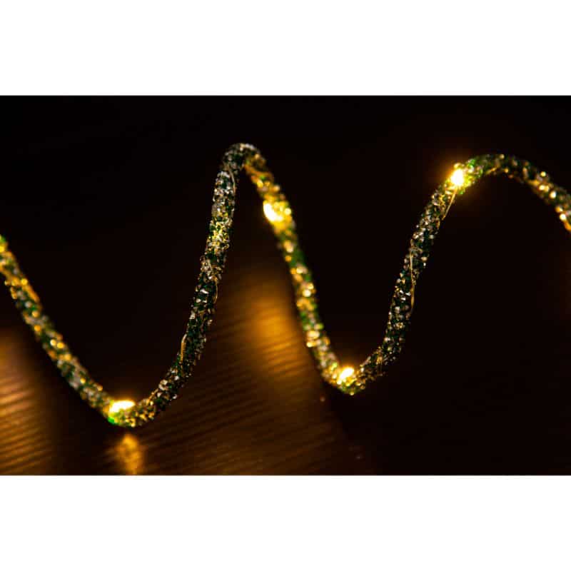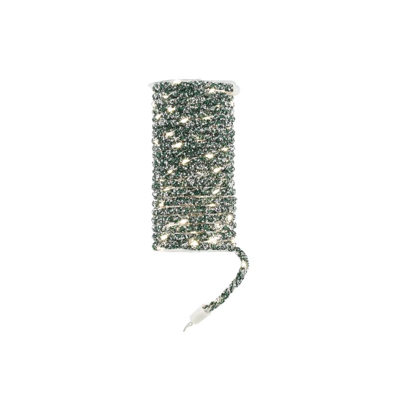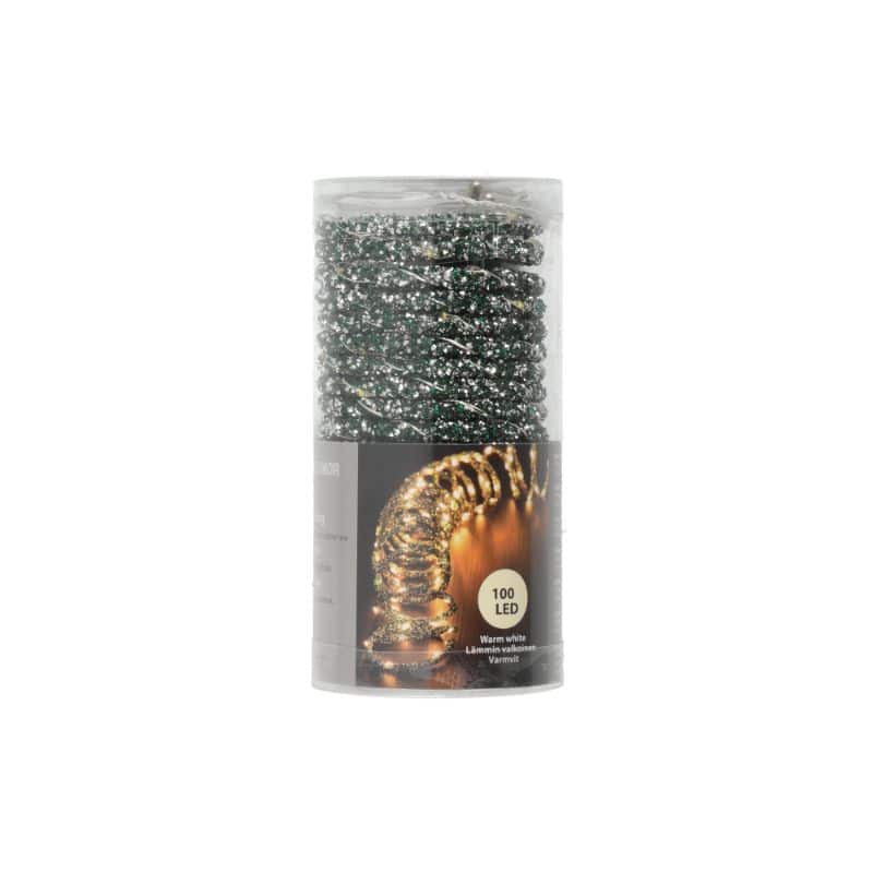 Kaunis vihreä glitterinen 100 kappaleen micro LED hopealankainen valoketju sisä- ja ulkokäyttöön. Ledejä on 5 cm:n välein ja valoketjussa on chenillekoristeltu