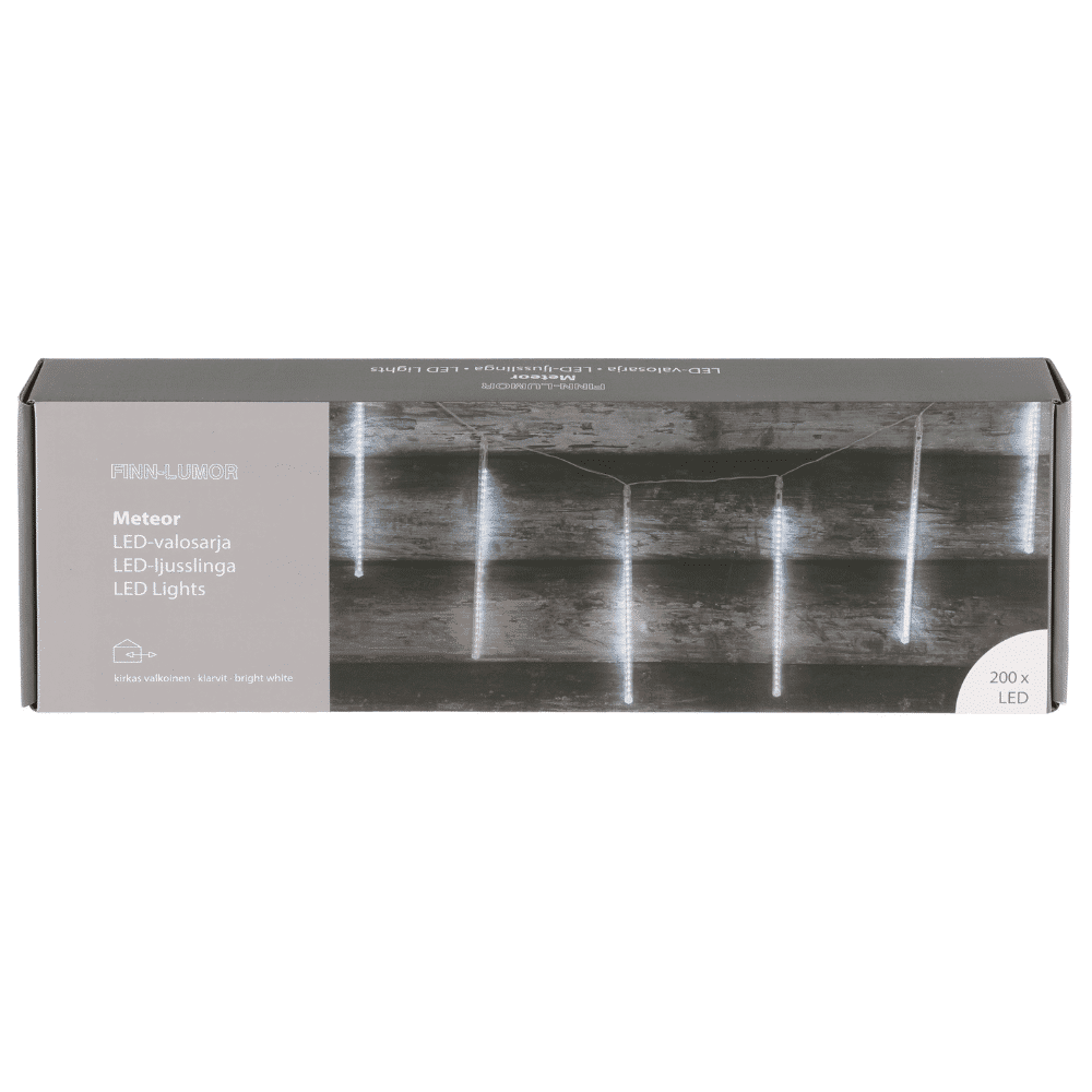 200 kpl kirkas valkoinen LED 3V, 0,06W. 10 valopuikkoa 32 cm, joissa jokaisessa 20 led-valoa. Liikkuva valo. Muuntaja 4,5V, 2,25W, IP44. Valaisin puikkojen väli 20cm. Johto 5 m. Sisä- ja ulkokäyttöön.