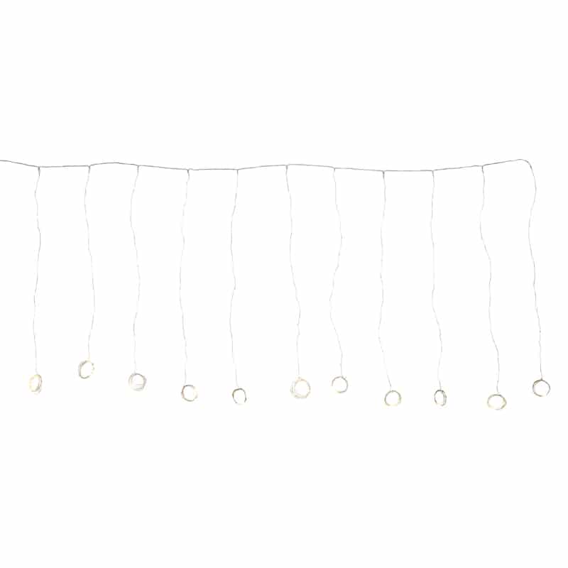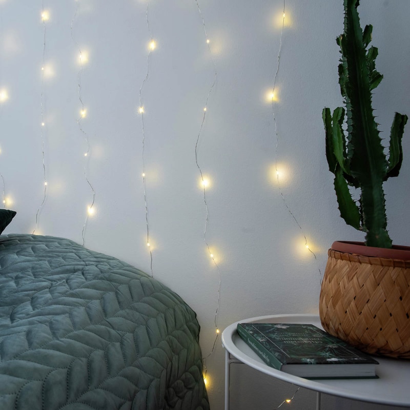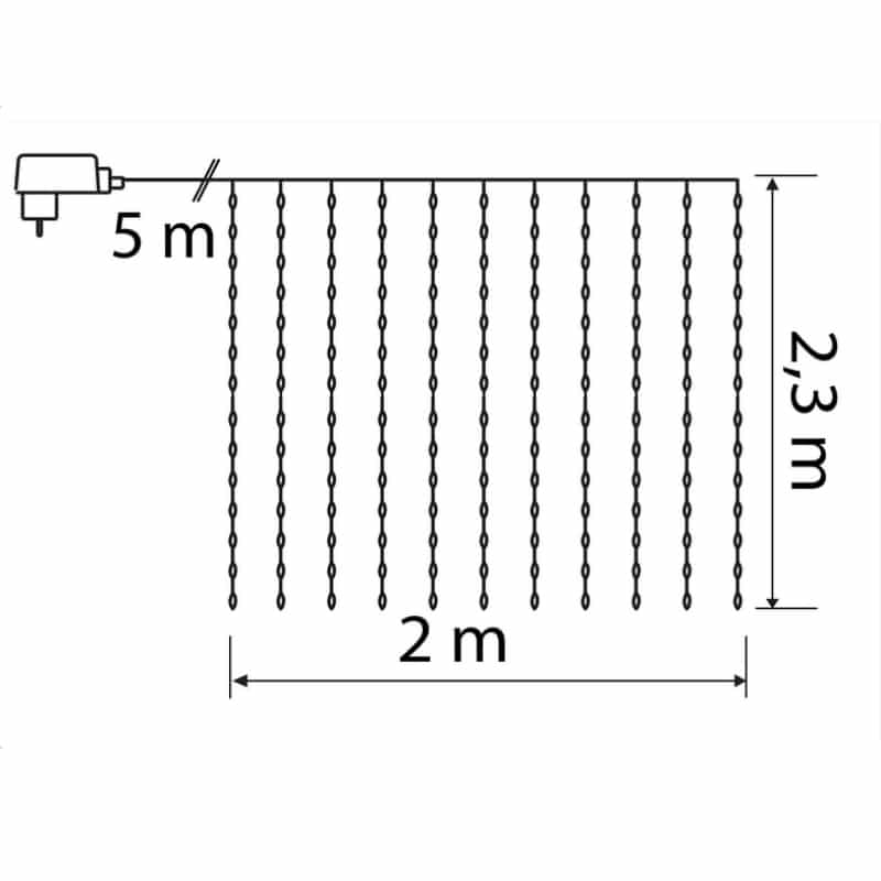 Upea valoverho, jossa on kahdeksan erilaista valotoimintoa sisä- ja ulkokäyttöön! Vaihtele valoefektejä muuntajassa olevan painikkeen kautta ja luo erilaisia tunnelmia: saat esim. tasaista tai eri tavoin vilkkuvaa valoa. Aseta valoverho roikkumaan sellaisenaan tai läpikuultavan kangasverhon taakse, jolloin valo kajastuu kauniisti. Verhossa on 11 kpl valoketjuja. Ajastintoiminto: 6 h päällä, 18 h pois päältä. Jokaisen toiminnon voi ajastaa. Paina muuntajan painiketta pohjaan yli kolme sekuntia. Vihreä valo merkitsee, että ajastintoiminto on päällä.