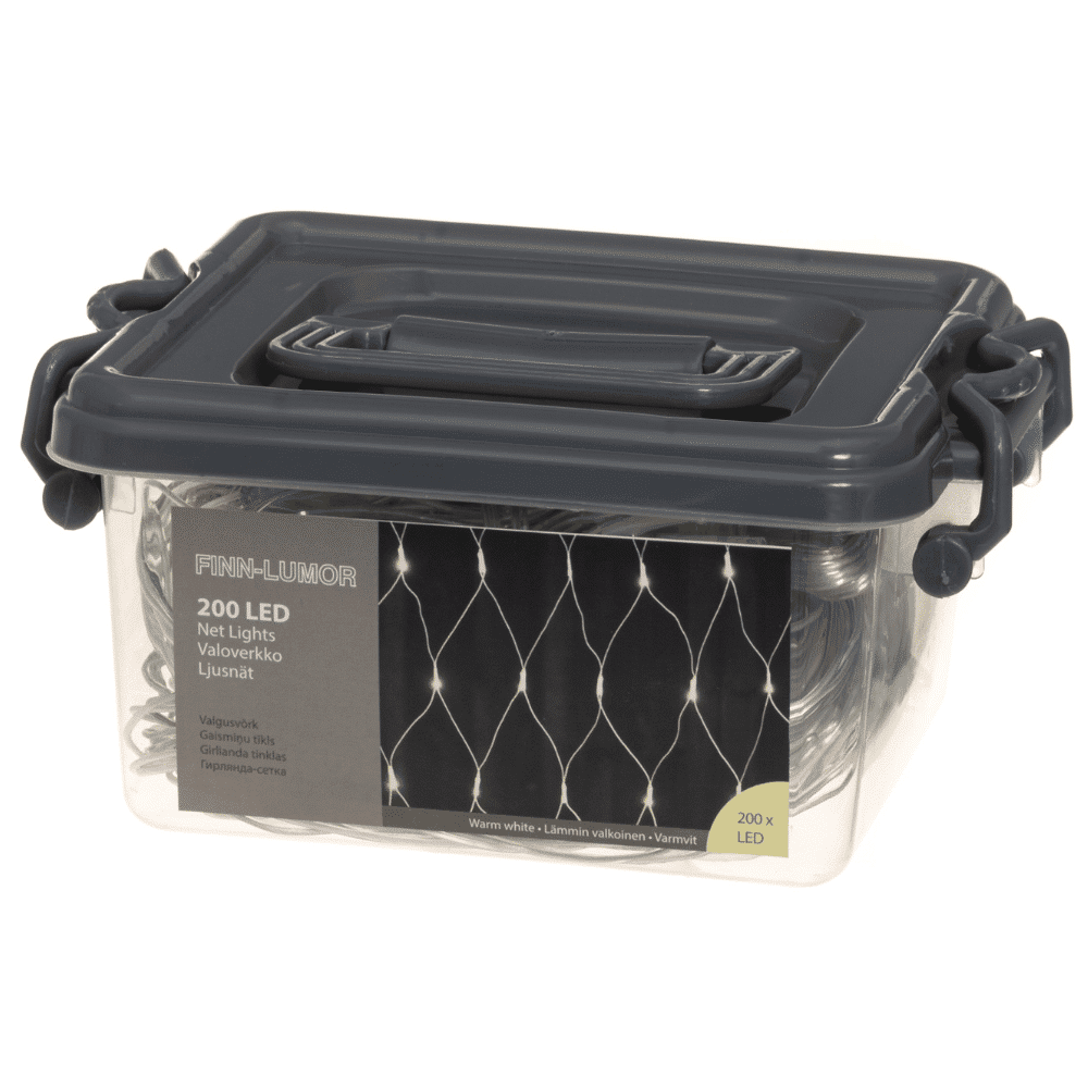 Valoverkolla saat helposti upean ja näyttävän kausivalaistuksen. Valoverkossa on 200 kpl lämmintä valkoista LEDiä. Läpinäkyvä johto 5 m. Muuntaja 31V, 6W, IP44, sisä- ja ulkokäyttöön. Valot on pakattu kestävään muoviseen säilytyslaatikkoon.