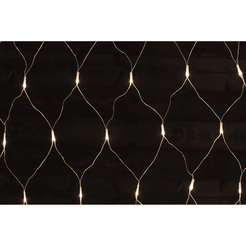 200 kpl lämmin valkoinen LED, 3V, 0,06W. Muuntaja 31V, 6W, IP44. Valoverkko 200 x 150 cm. Johto 5 m läpinäkyvä. Sisä- ja ulkokäyttöön.