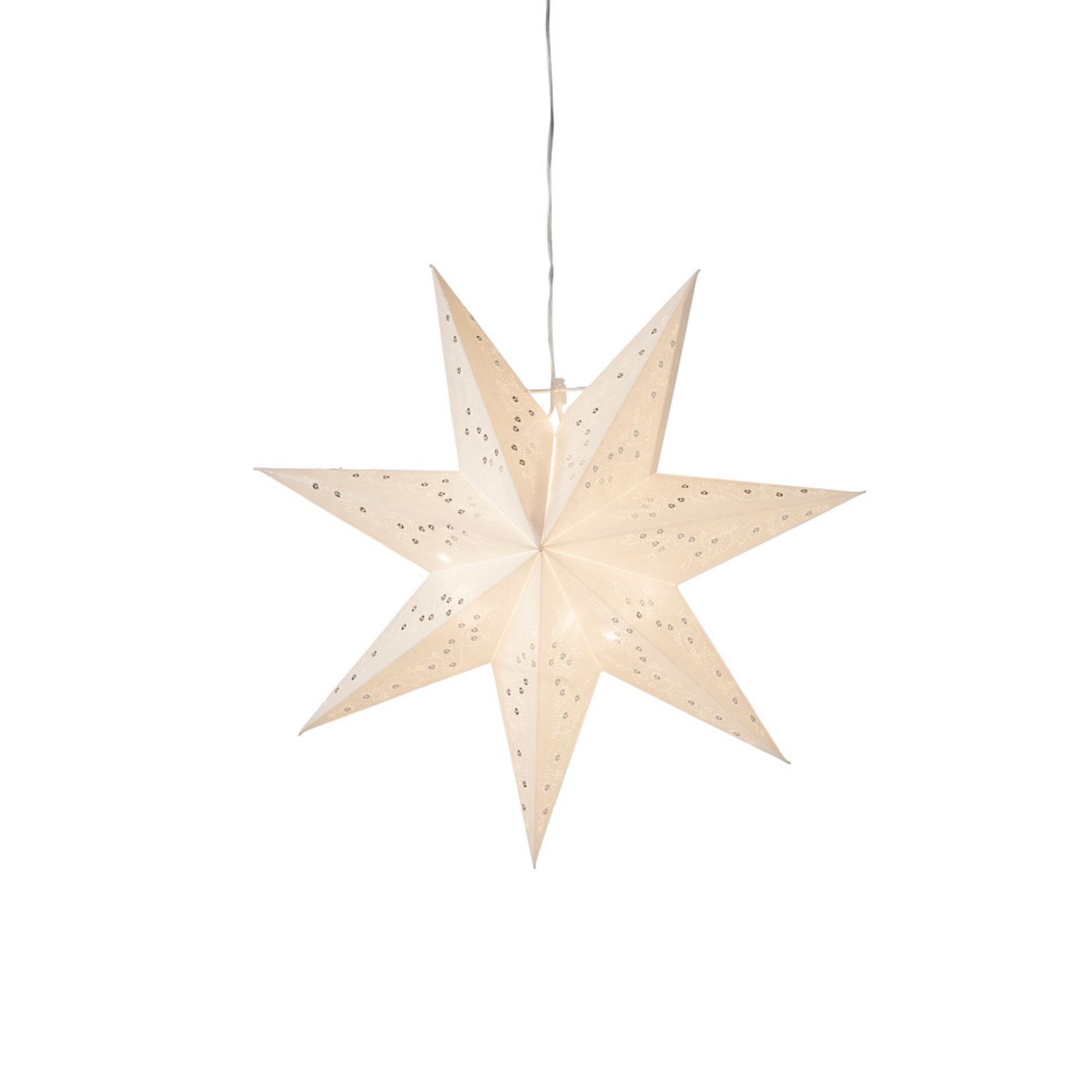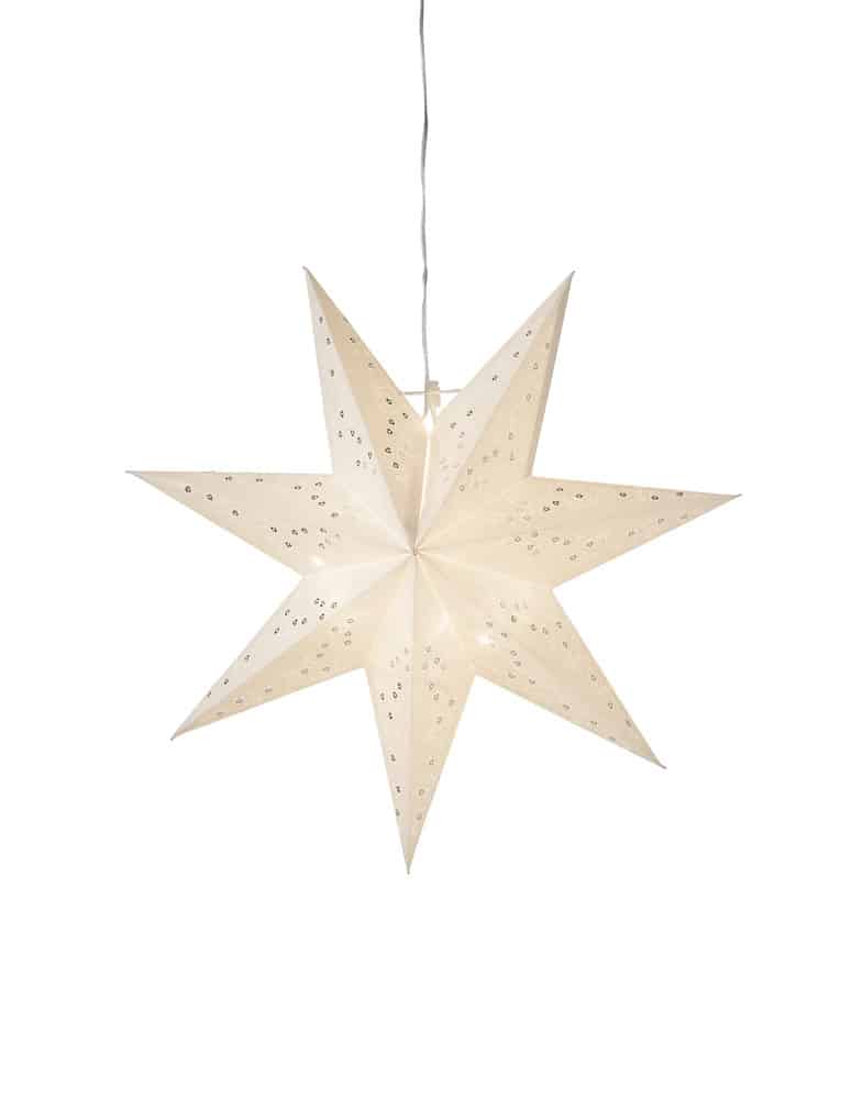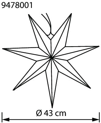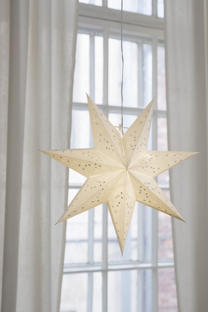 Kaunis, paljettikoristeltu 7-haarainen paperitähti. Suljetaan nauhoilla.