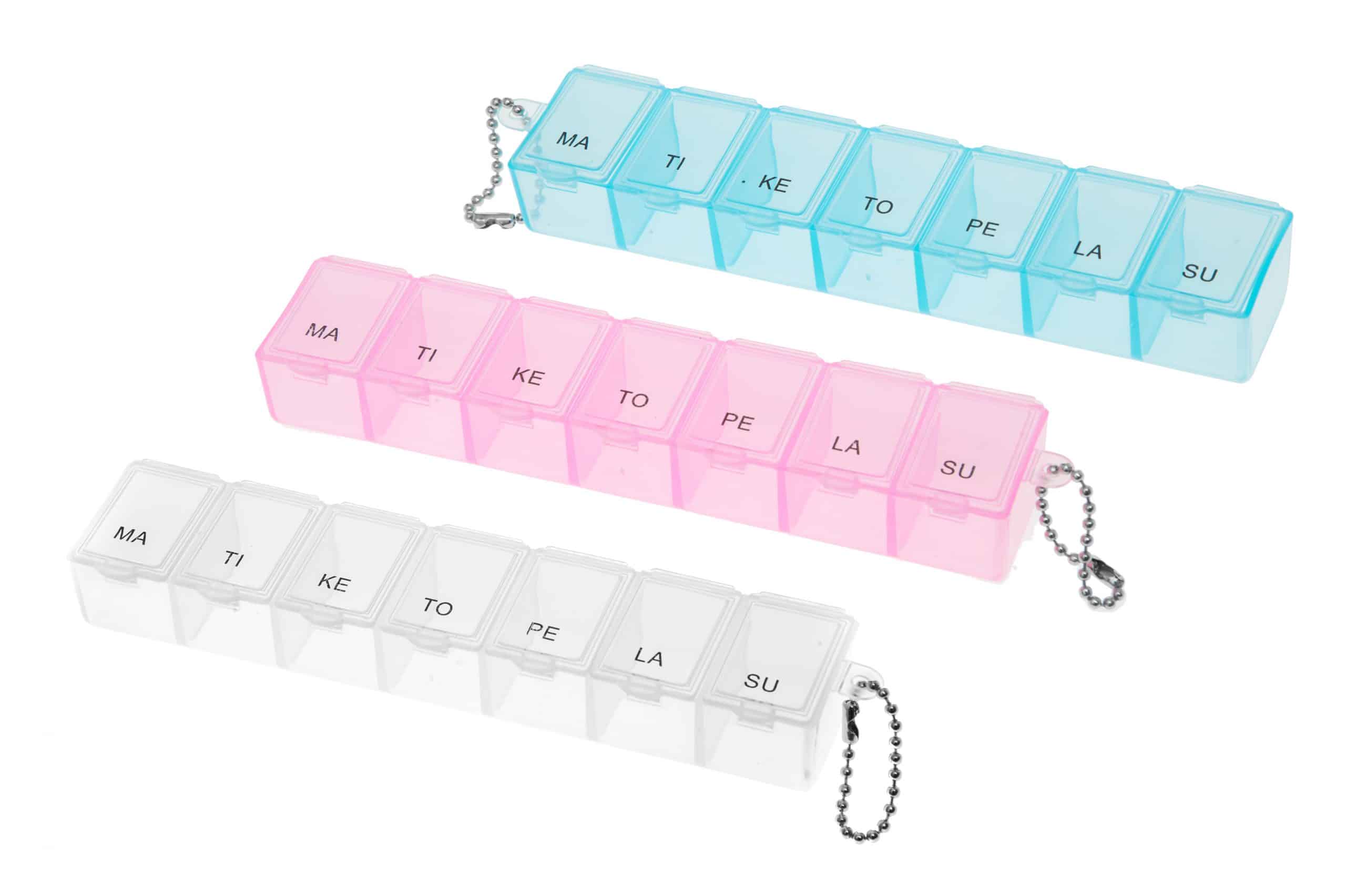 Lääkeannostelija viikon tarpeeseen. Kätevä esimerkiksi matkoilla. Ripustuslenkki.