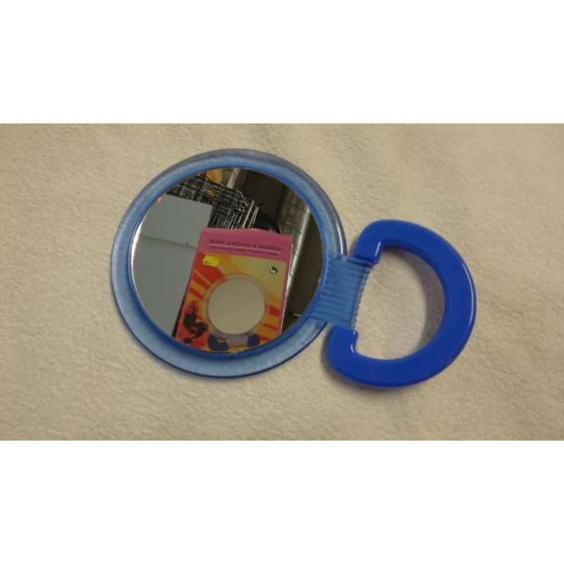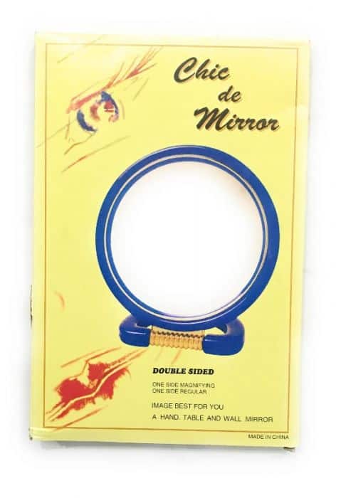 Pöytäpeili muovi, jossa on reunat ja alusta, peilejä on molemilla puolilla joista toinen peilaa lähemmäs.