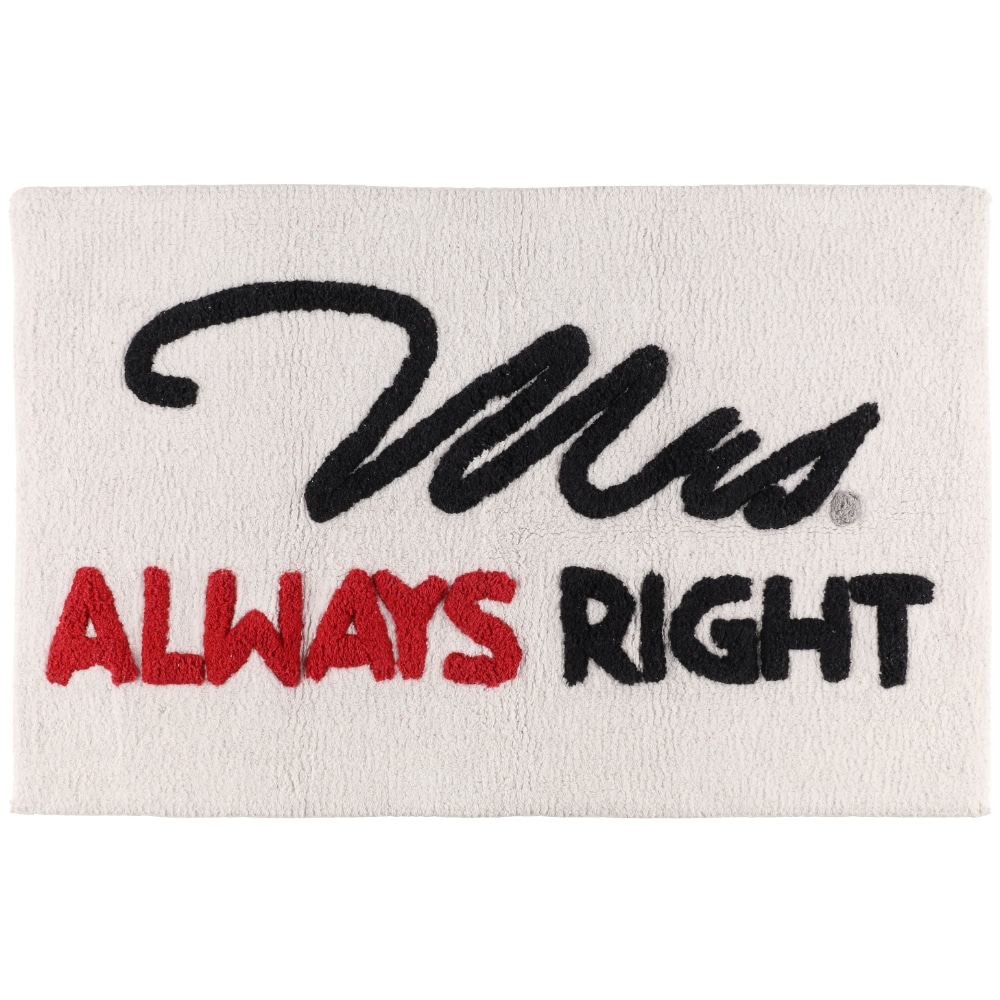 Tyylikäs valkoinen puuvillasta valmistettu kylpyhuonematto kosteisiin tiloihin. Vessamatossa on Mrs. Always Right-teksti. Pese matto 40 asteessa saman väristen kanssa.