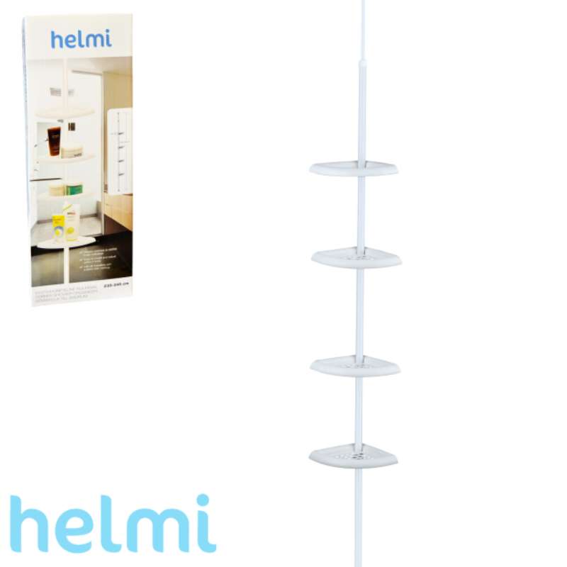Säädettävä Helmi Kylpyhuoneteline, jonka voi asentaa helposti kulmaan teleskooppitangon avulla ilman laattojen poraamista. Säädettävä korkeus 235-245 cm. Kylpyhuonetelineessä on 4 muovista hyllyä. Rungon materiaali maalattua terästä. Väri valkoinen.